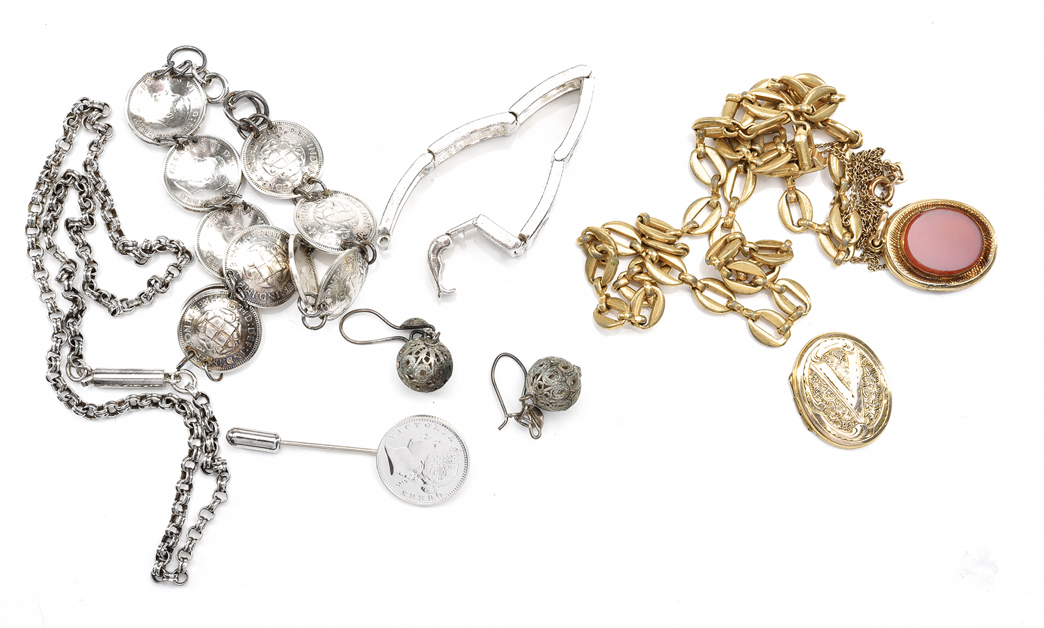 A COLLECTION OF VINTAGE JEWELLERY IN SILVER AND SILVER GILT, COMPRISING BRACELET, LOCKET (A/F), CHAIN ETC
