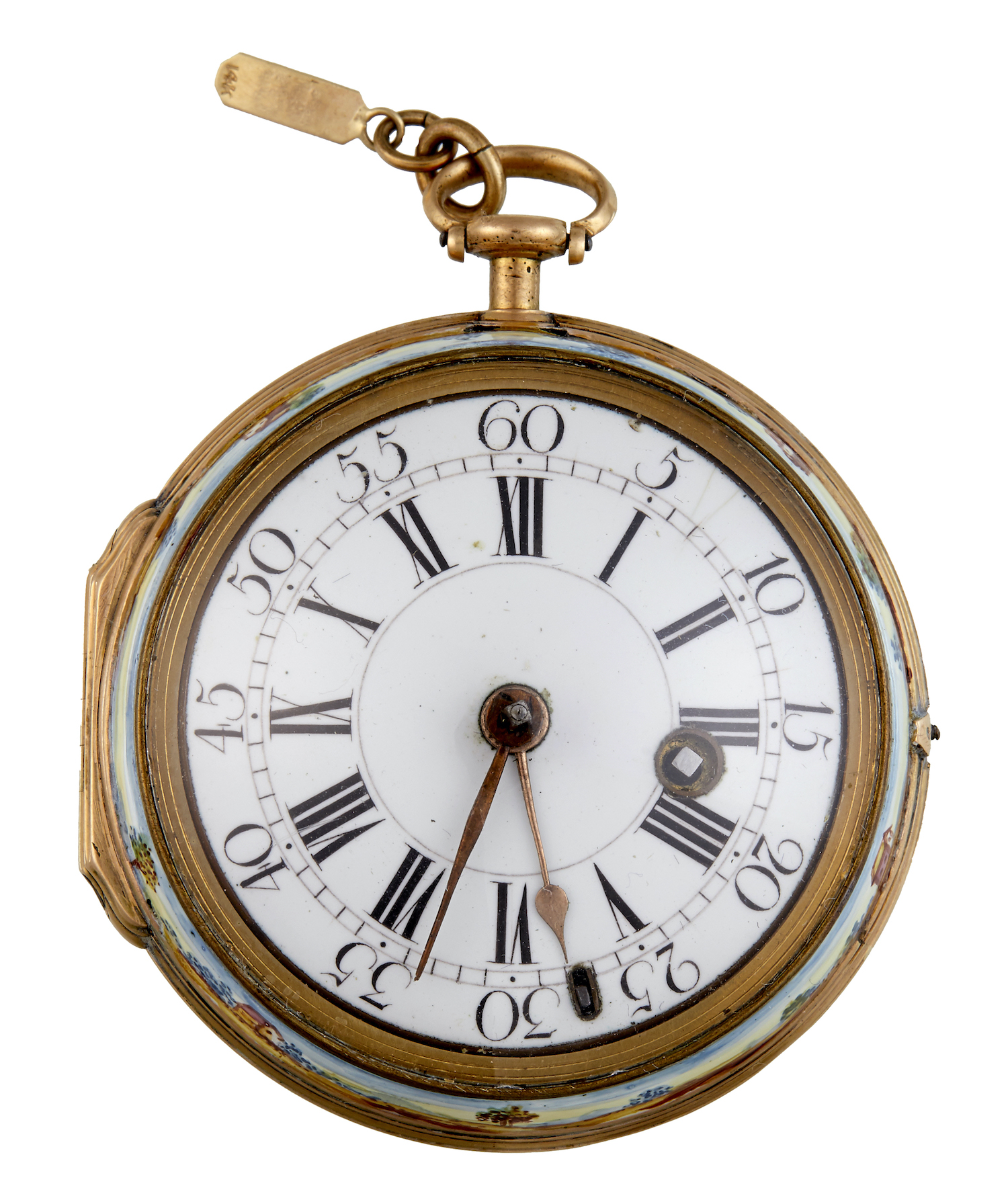 The movement with five sided baluster pillars, pierced and engraved balance bridge and large silver regulator dial, white enamel dial with Roman numerals and outer Arabic minute ring. The back with a polychrome miniature of winged Jupiter abducting a maiden, the inside of the back with a landscape, the pendant stamped with the makers initials 'AD', surmounted by a crown.