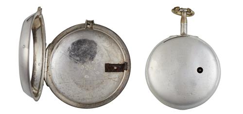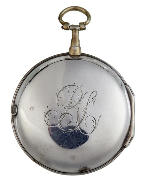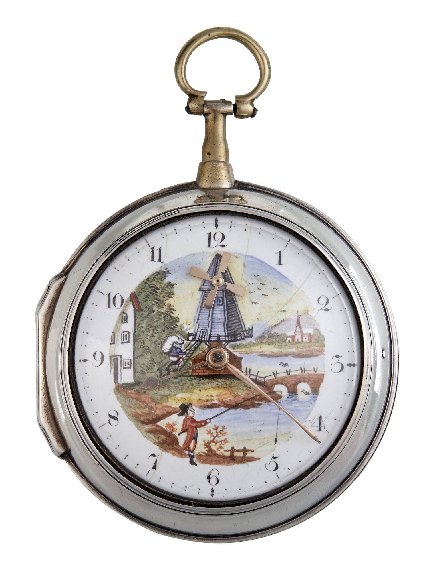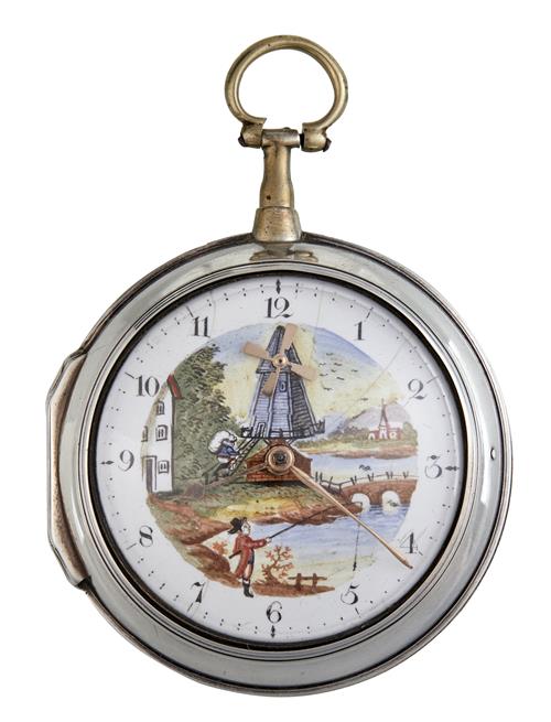 The full plate movement with engraved and pierced balance cock, fusee and chain, turned pillars, worm and wheel barrel set between the plates, silver regulator disc. Movement signed 'JNO Jackson, Boston'. The polychrome dial depicting a fisherman in a windmill landscape with Arabic numerals. The plain silver inner case and outer case hallmarked London 1791.