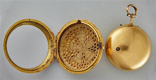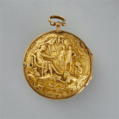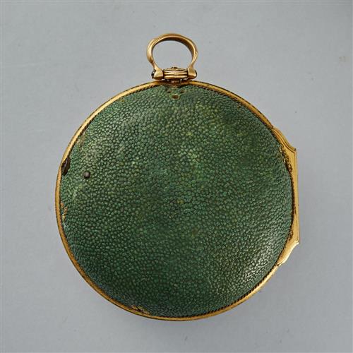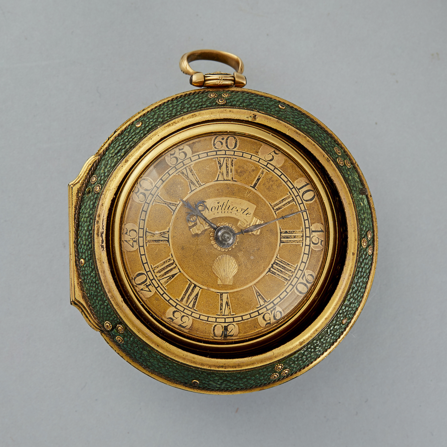 The gilt metal plate movement with finely pierced and engraved balance cock, silver regulation, square baluster pillars, movement signed 'Sam Northcote, Plymouth'. The gold champleve dial with black enamel Roman numerals and a five minute chapter ring, signed 'Northcote', blued steel hands. The gold inner case hallmarked London 1764, maker Richard Palmer I, the outer gilt metal case with repousse decoration in high relief of a classical scene of a seated emperor receiving gifts, together with an associated 18th Century shagreen protective case decorated with gold pin work.