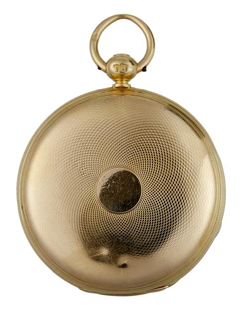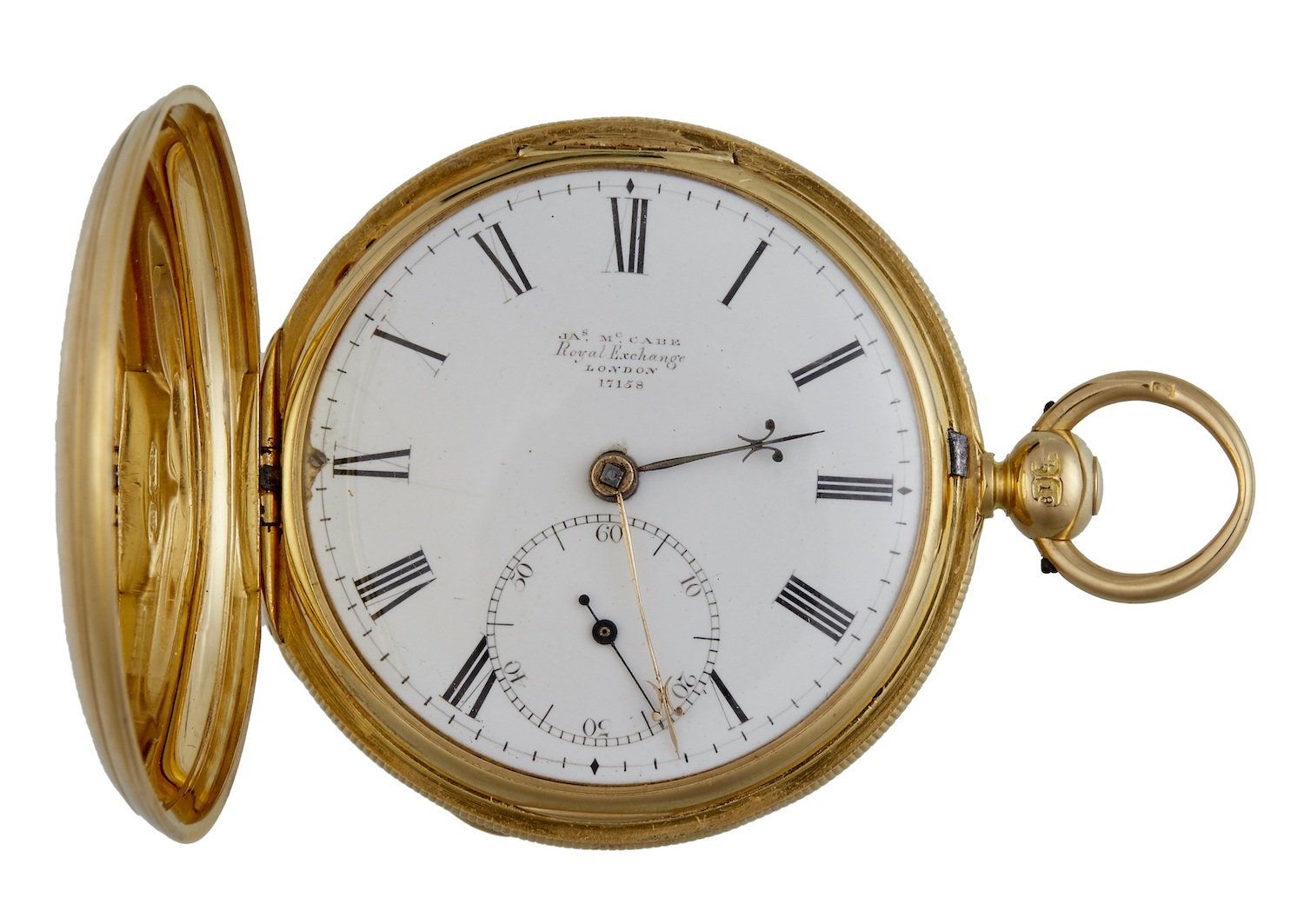 Fusee lever movement with compensated three-arm balance, signed and numbered gilt metal dust cap, enamel dial with black painted Roman numerals and outer five minuted divisions, subsidiary seconds at 6, gilt spade hands, polished and engine turned case hinged to the front with reeded band, "IMC" for McCabe himself. Dial and dust cap signed 'Jas McCABE, Royal Exchange, LONDON' and numbered 17158. The case hallmarked London 1838 and stamped S5.