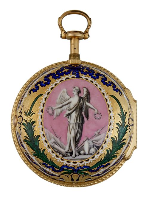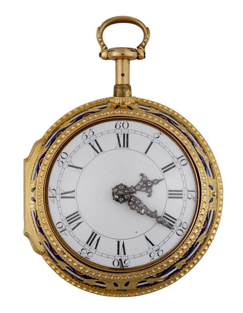 Signed on the back plate 'Fras, Perigal London 16900', the signature and number repeated on the dust cap. White enamel dial with Roman numerals, outer Arabic minute ring, paste set hands, the inner case pierced and engraved, numbered 16900 at the base of the pendant, hallmarked 1771, the bell scratch signed 'Drury' the outer case pierced at the bezels, the back centred with a sepia toned figure of Winged Victory against a pale pink ground, bordered by a green enamel wreath and further blue enamel decoration, both cases with casemaker's initials 'P.G' (Peter Goujon).