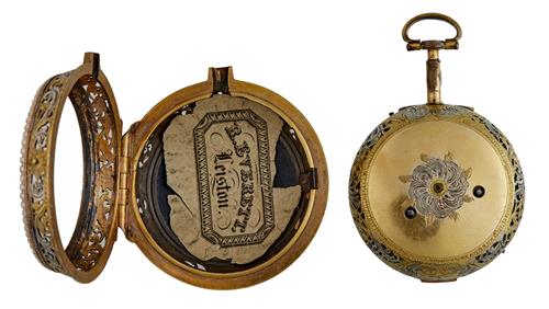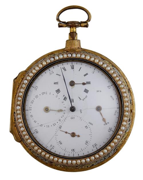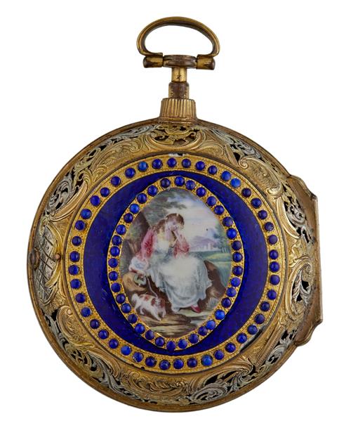 With day, date, hour subsidiary second hand. The unsigned chain fusse movement engraved plate with pierced and engraved balance cock. White enamel dial, the gilt and silvered inner case with pierced and engraved decoration. The associated outer gilt and silvered metal case decorated with dark blue enamel and a central classical scene of a maiden in a classical landscape with a border of seed pearls.