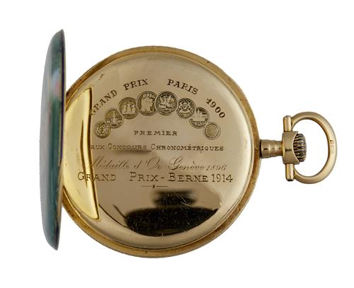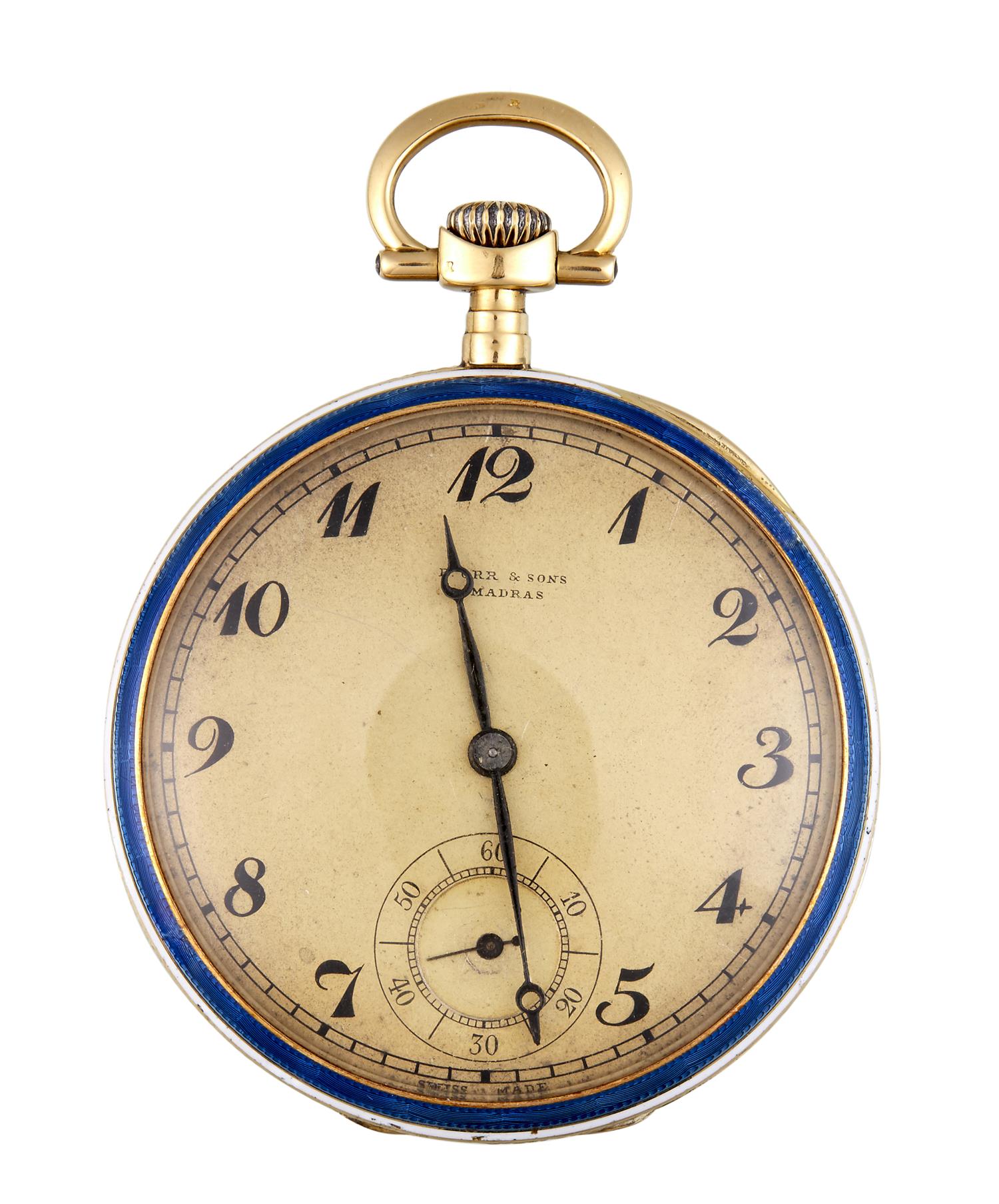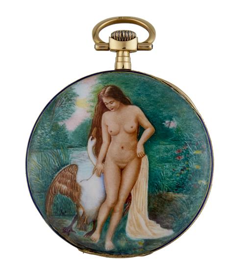 Signed 'P. Orr & Sons, Madras'. Swiss lever movement, 16 jewels, gilt dial with Arabic numerals, subsidiary seconds. The circular shaped case outer decorated with polychrome enamel depicting Leda and the Swan. The dial signed 'P. Orr & Sons, Madras'. Movement signed 'Grand Prix 1900'. The factory engraved cuvette 'Grand Prix 1900'.