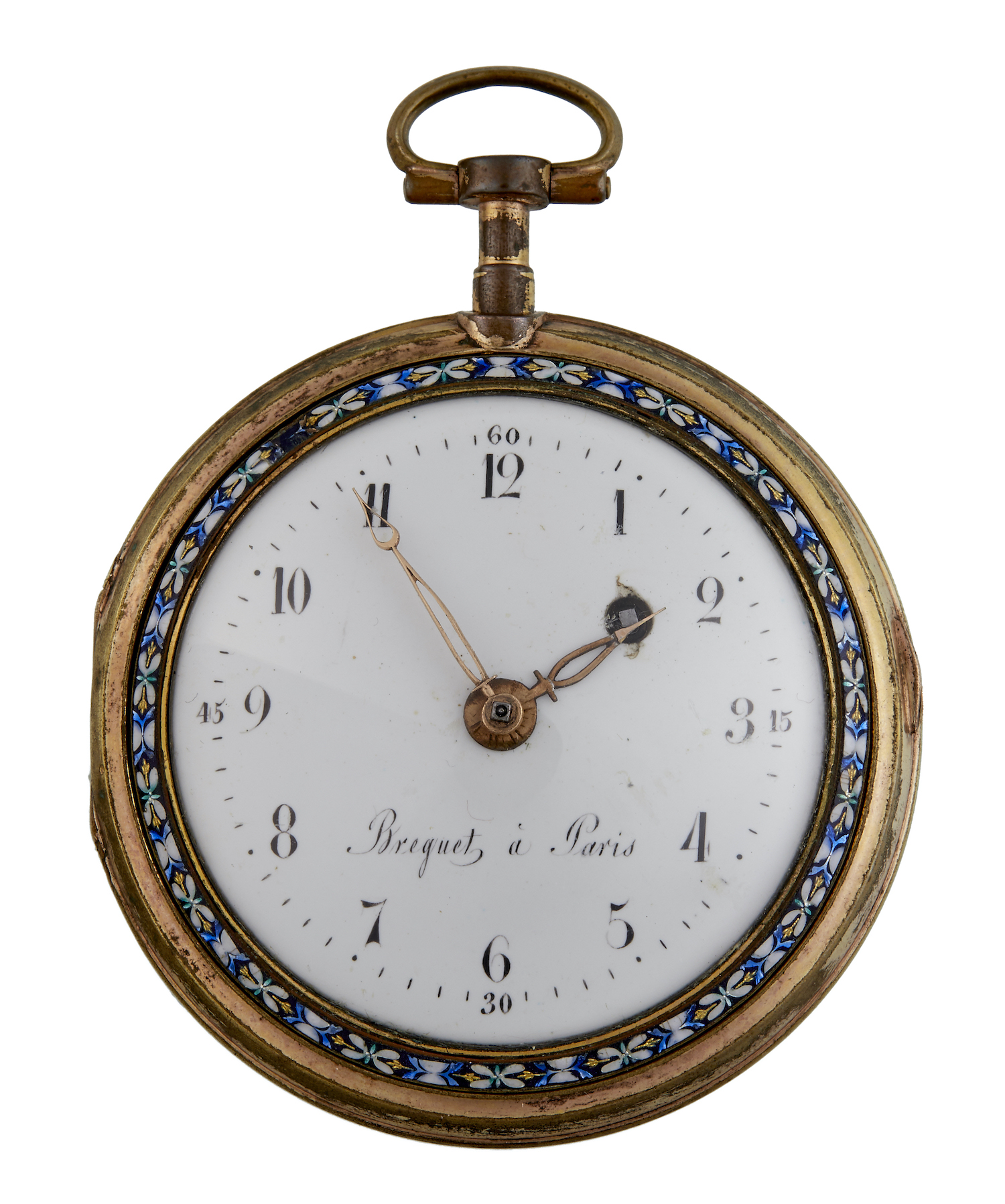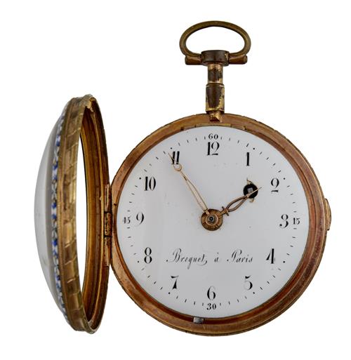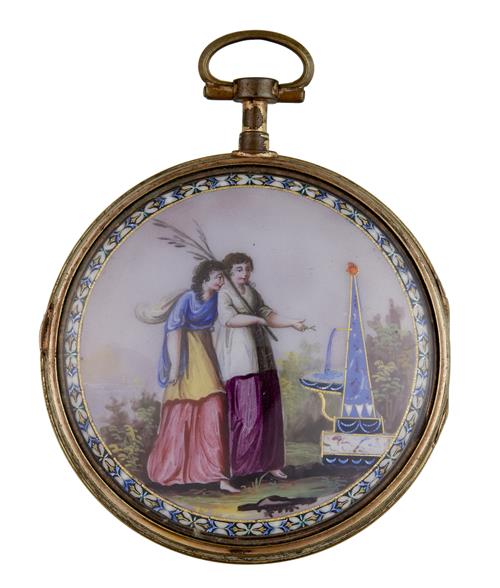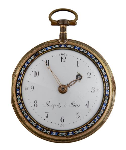 Frosted gilt plate movement with pierced and engraved balance cock. The white enamel dial with Arabic numerals and gold pierced lozenge shaped hands. The circular case with hinged bezel. The back enamelled classical scene of two women by an obelisk shaped water fountain, with the original gilt metal outer case. Both the dial and movement signed 'Breguet, Paris'.