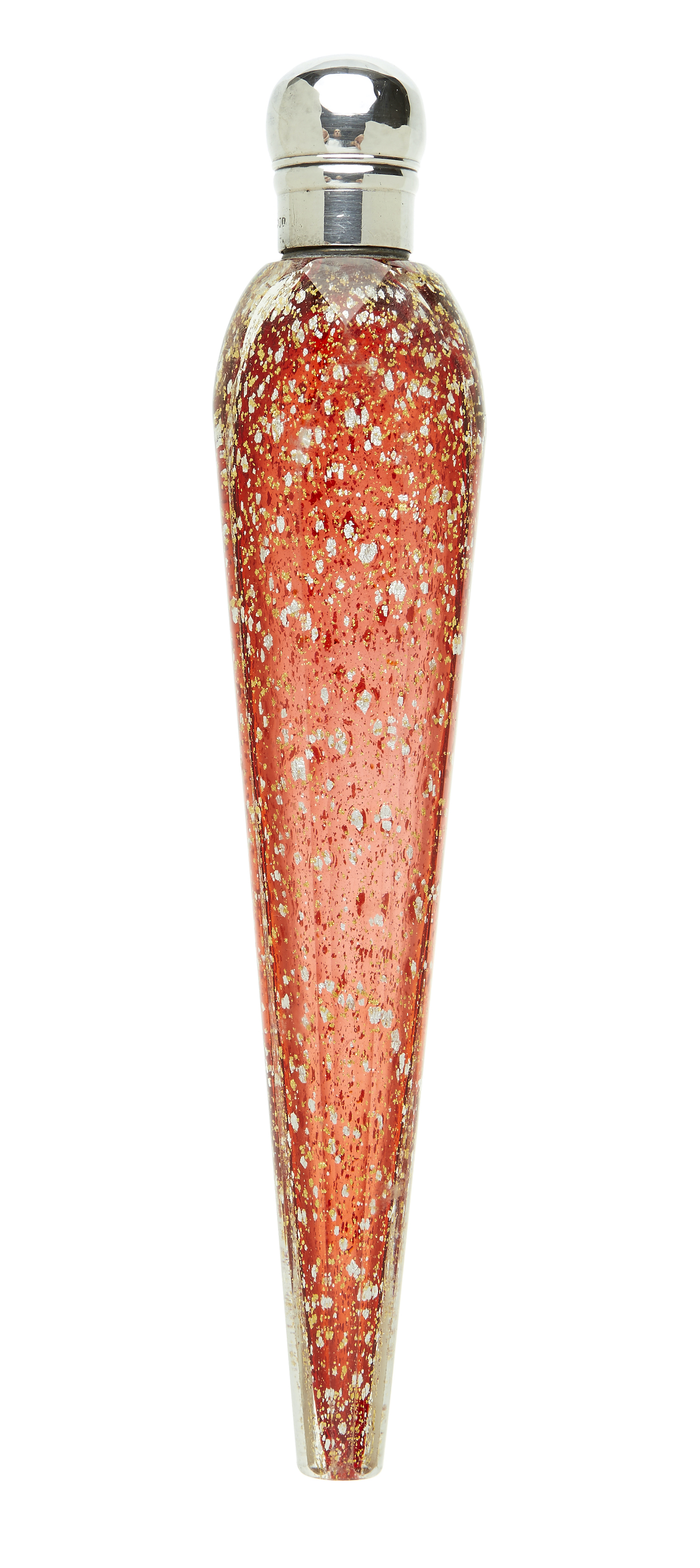 The facetted cranberry glass body speckled with gold and white flecks. The silver screw on top hallmarked London 1884. Maker Charles Mappin, Mappin Brothers, Regent Street London.