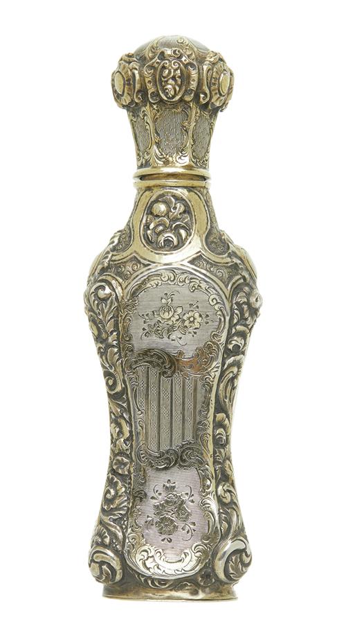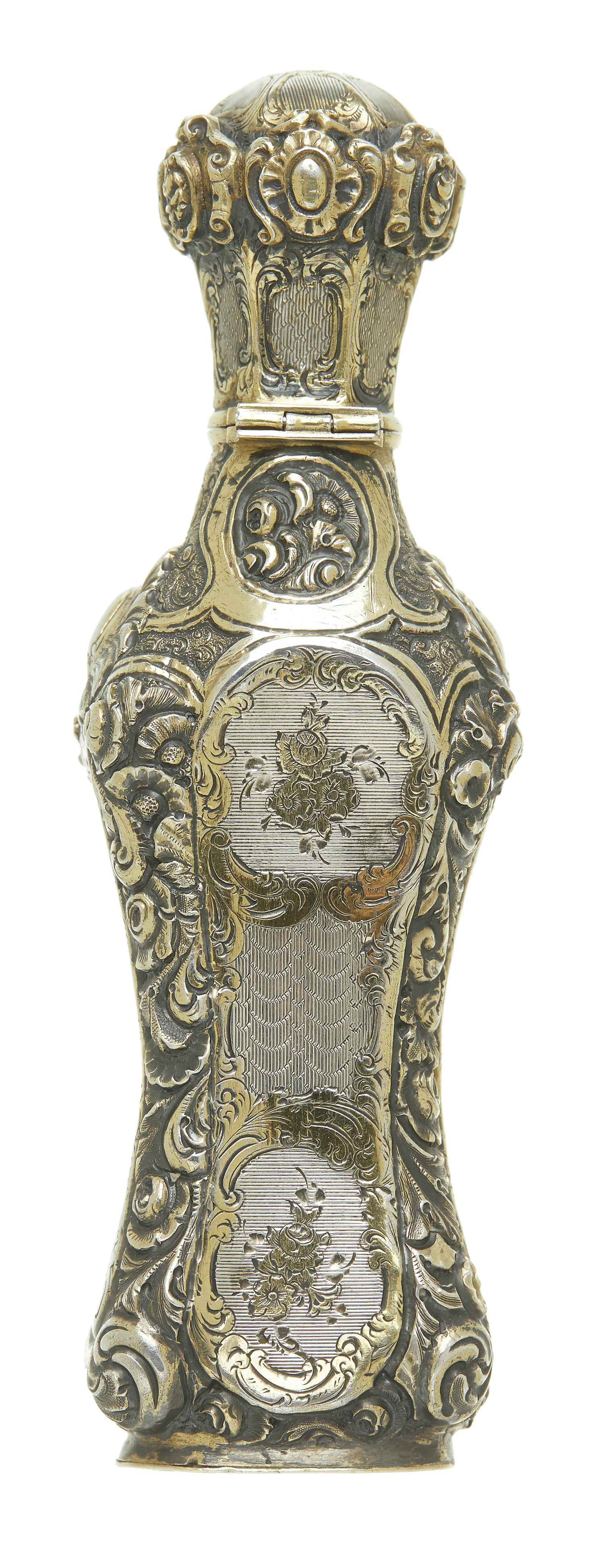 Profusely decorated with engraved panels in silver and gilt of flowers and scrolls bordered with raised embossed foliated borders, hinged top with glass stopper.