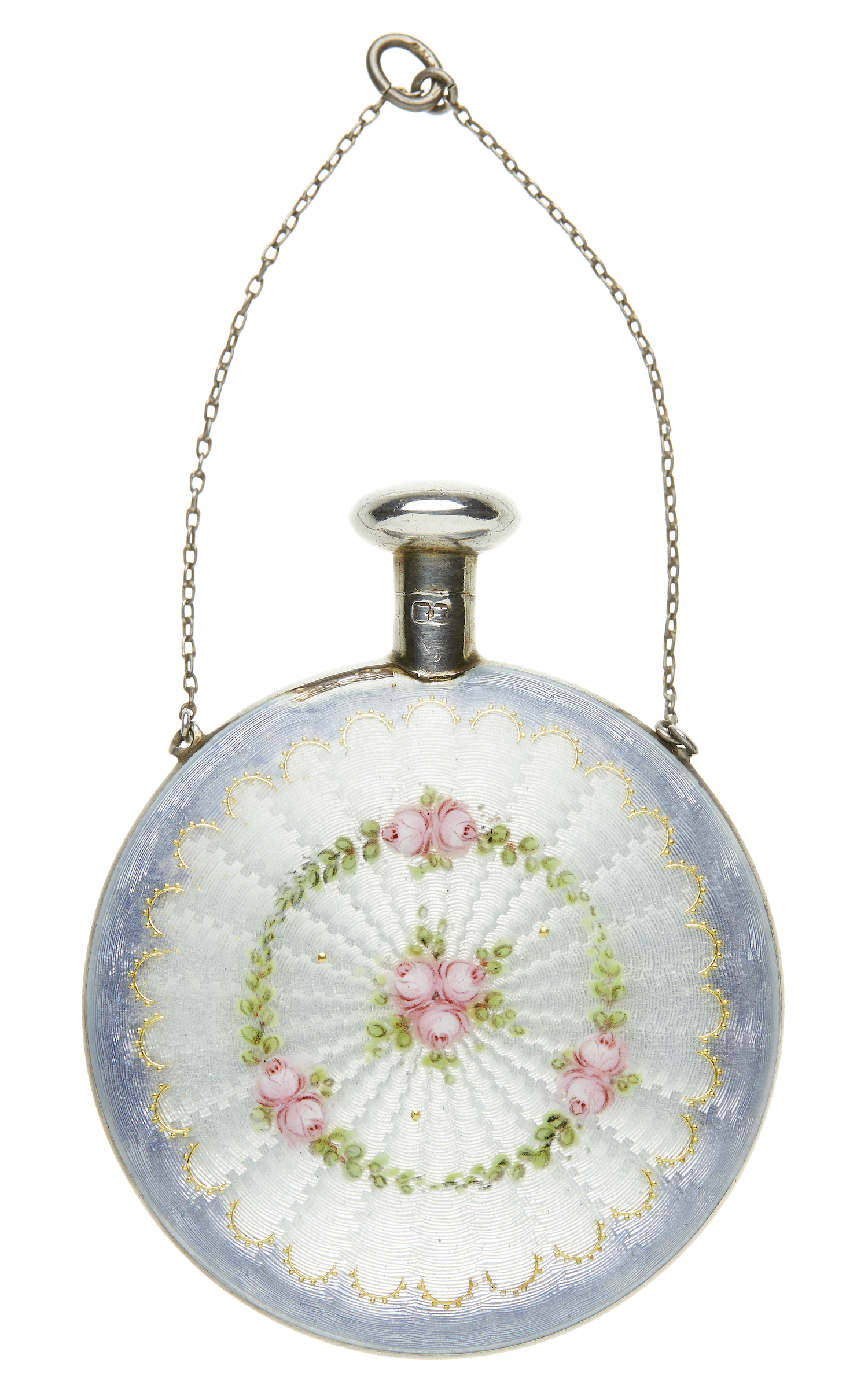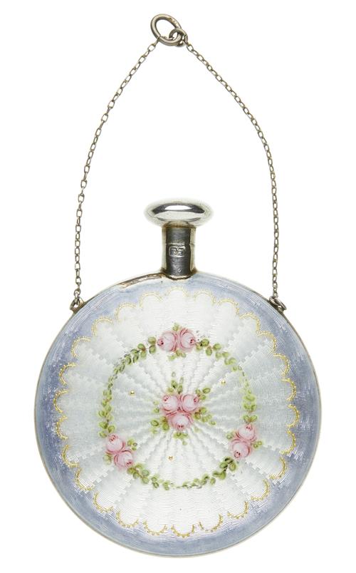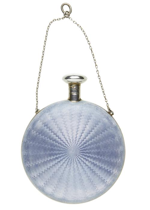 A STERLING SILVER AND GUILLOCHÉ ENAMEL SCENT FLASK