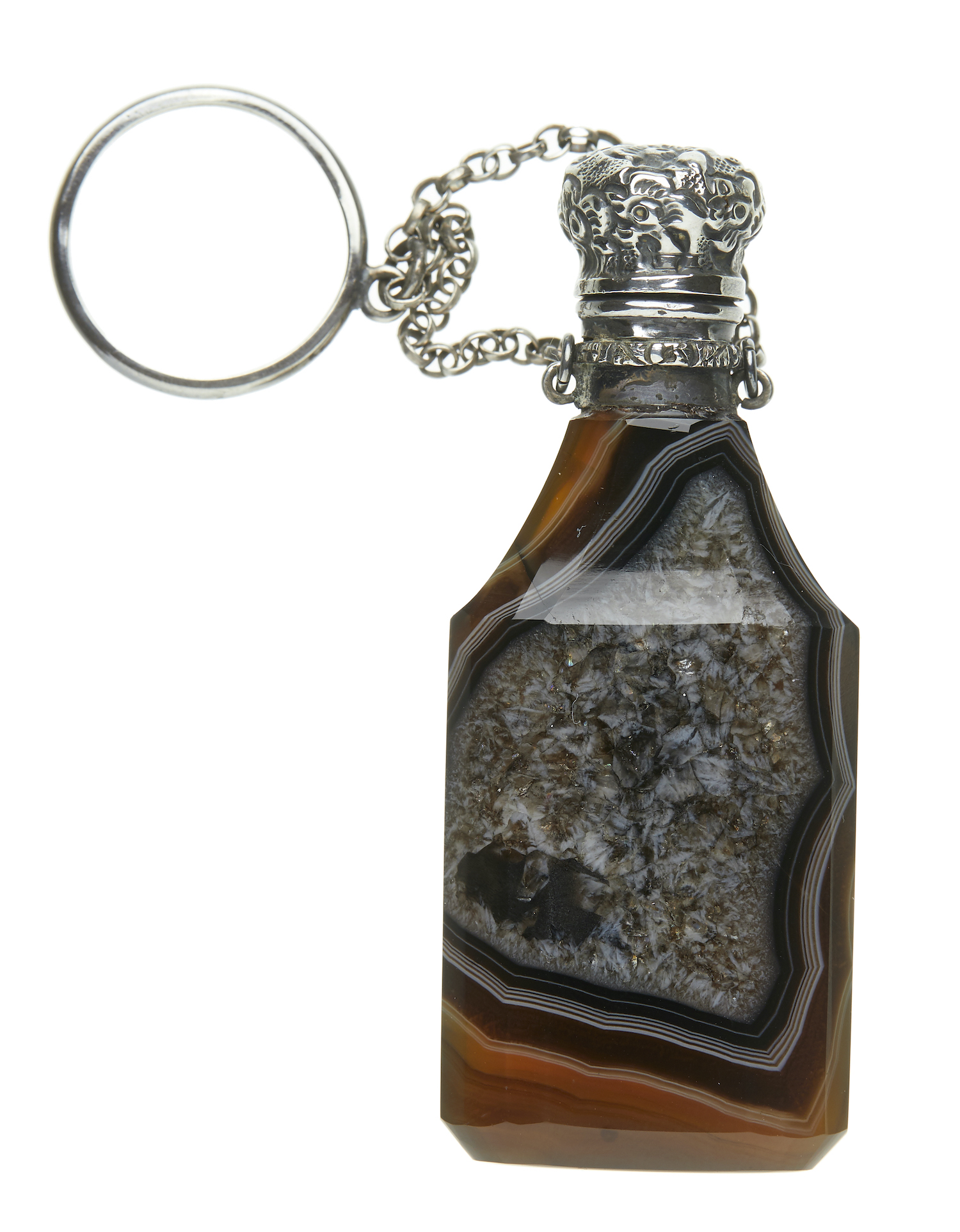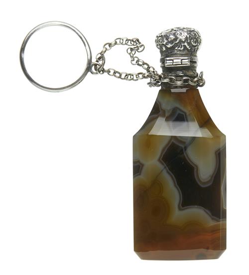 The faceted agate body below a silver collar and foliate embossed hinged cover, glass stopper.