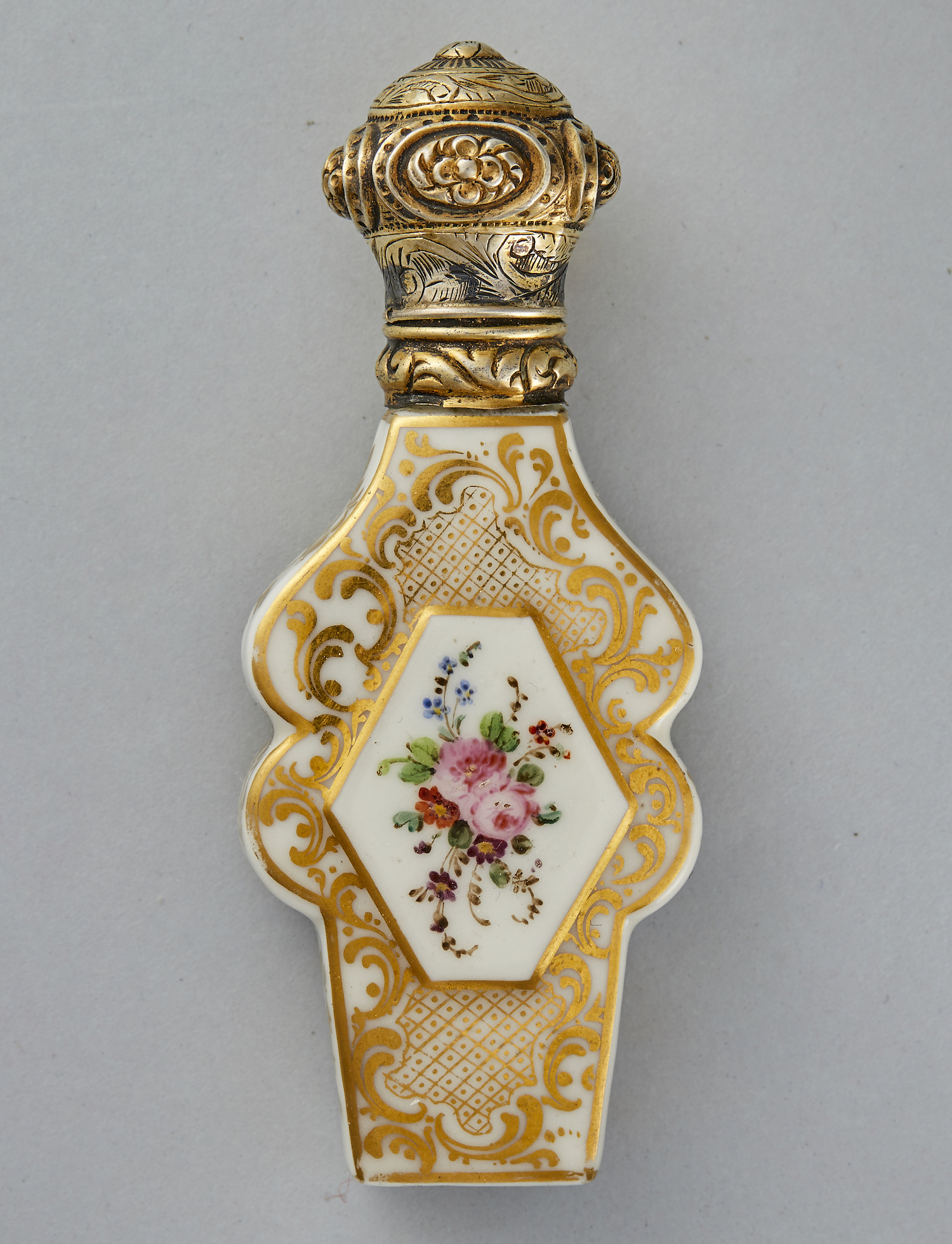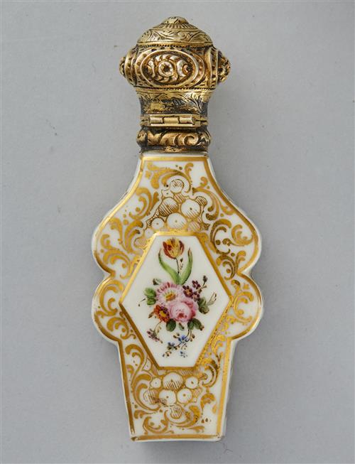 A FRENCH 19TH CENTURY PORCELAIN AND SILVER GILT SCENT BOTTLE