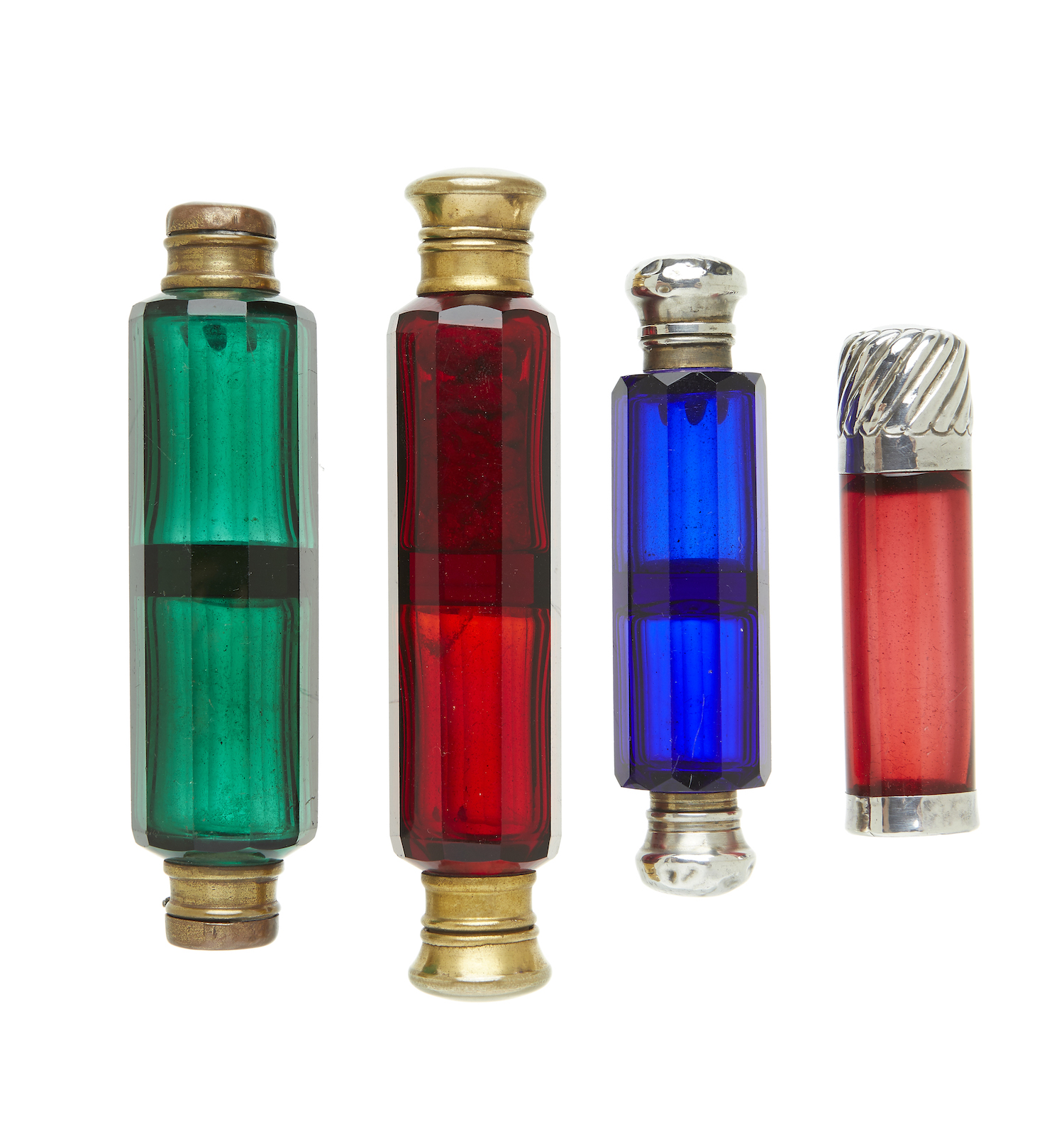 Three double ended; one red-double ended with gilt metal mounts, length 12.5cm. One green glass double ended with gilt metal mounts, length 11.5cm. One bristol blue glass double ended with silver and metal mounts, length 10cm. One red glass smelling salts bottle with sterling silver mounts, hallmarked Birmingham, maker C. C. May (Charles May), length 8cm.