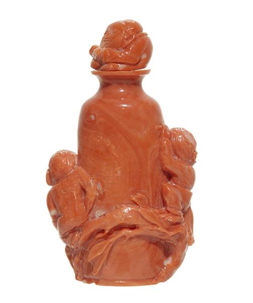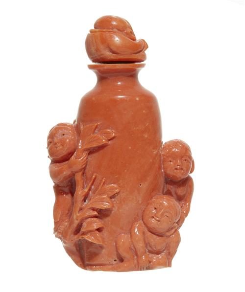 Cylindrical shape, carved with three children on branches, carved stopper.