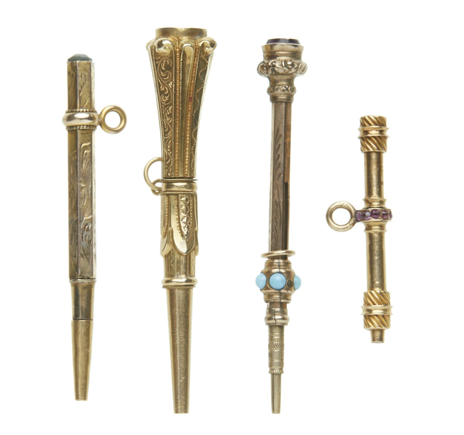 Pencil set with turquoise. Two of the watch keys in the form of propelling pencils, one as a 'T' bar and set with facetted red stones.