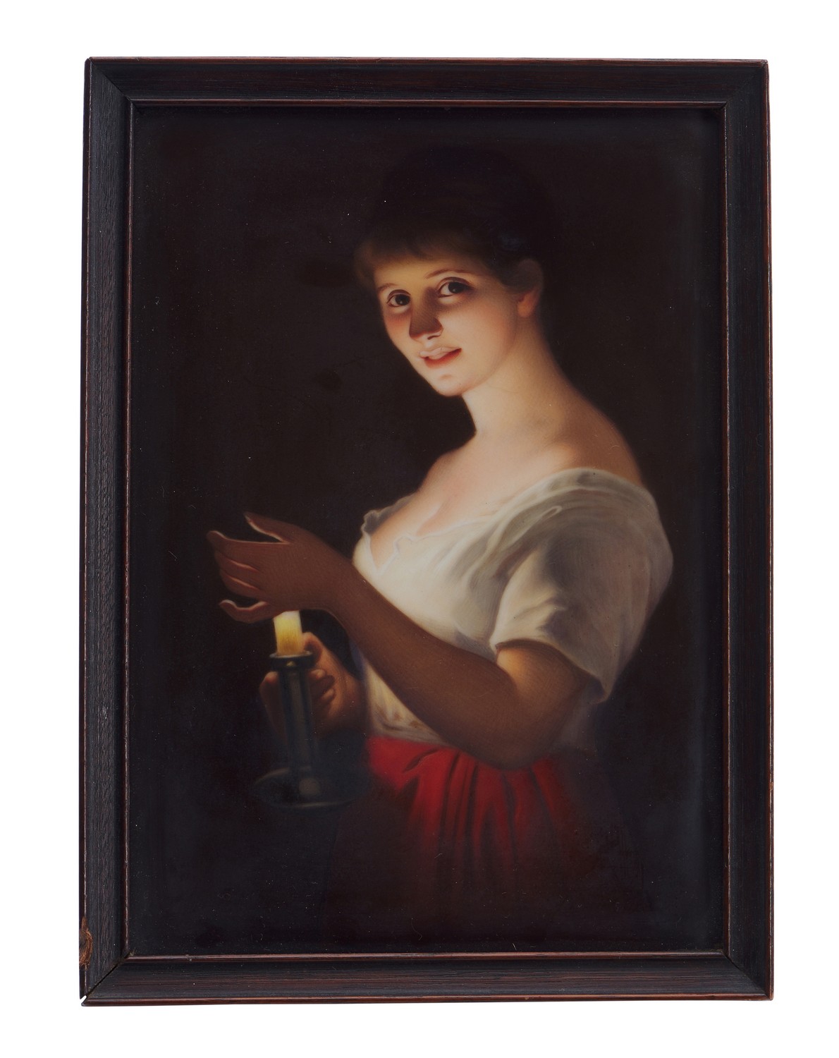 The rectangular panel painted to depict a young female illuminated by candle light, framed.