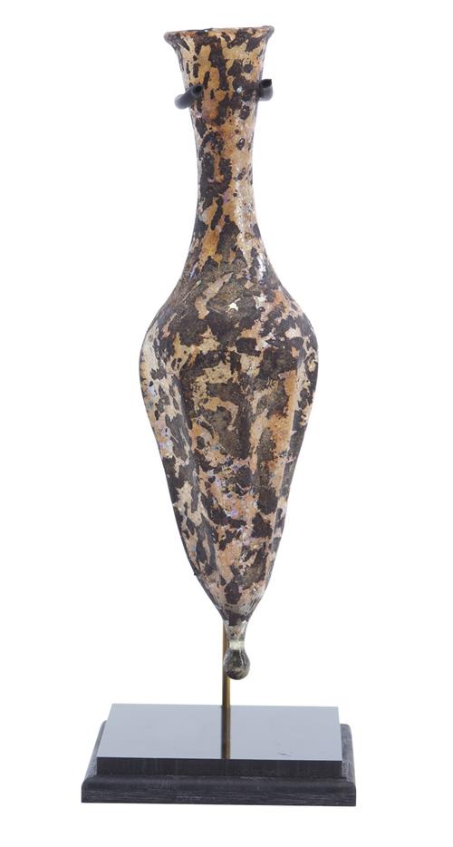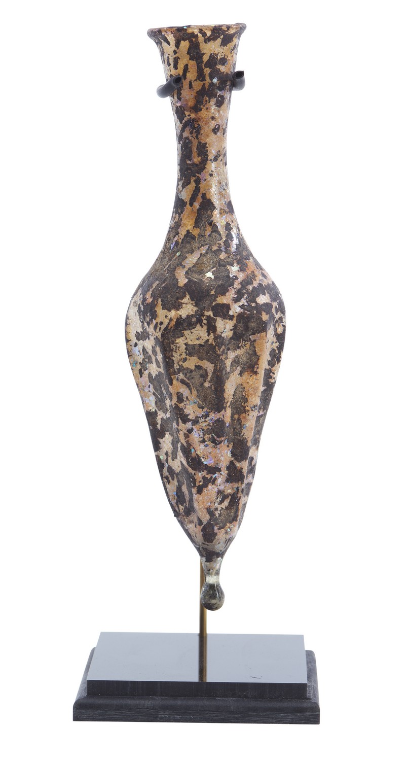 The mottled glass flask of ovoid faceted form with an elongated neck, presented on a custom display stand.