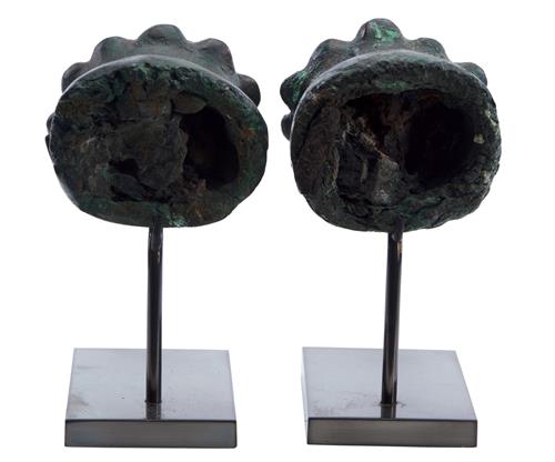 Areas of restoration on the snout of the smaller head, with a built up verdigris patina overall.