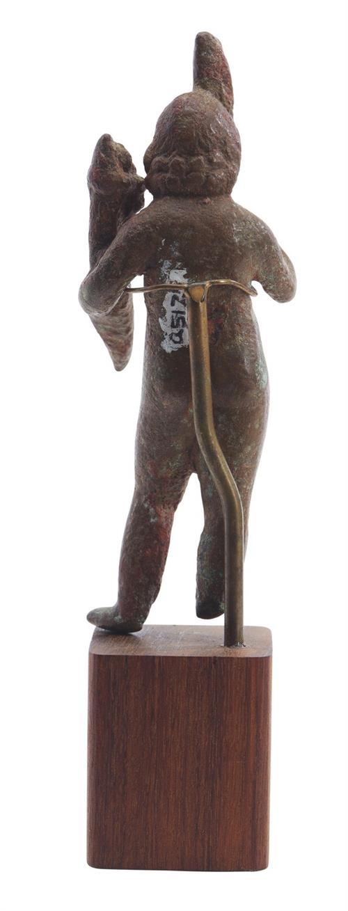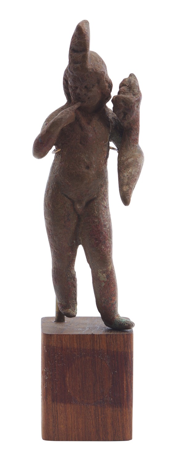 Modelled wearing the upper and lower crowns of Egypt, holding a cornucopia, and with index finger of right hand to mouth symbolising childhood. Presented on custom wood and brass display stand.