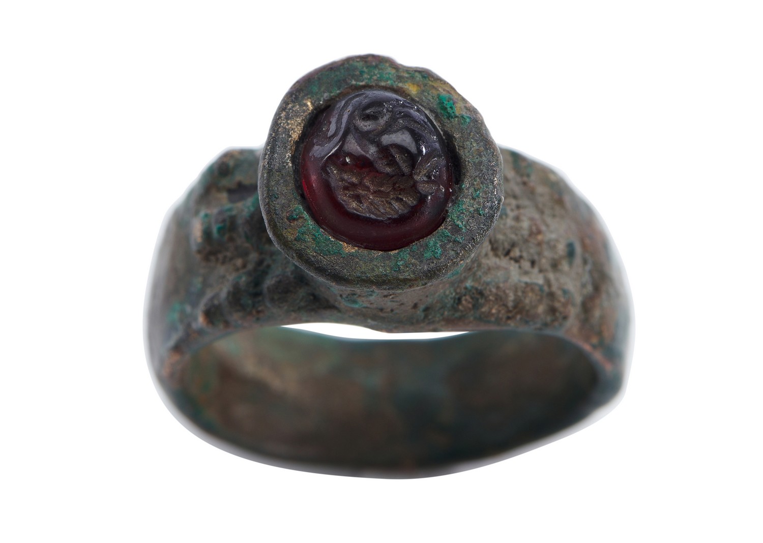 The bronze ring inlaid with a garnet bezel depicting a lion.
