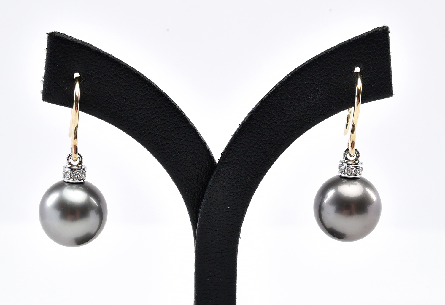 A PAIR OF TAHITIAN PEARL (11.5MM) AND DIAMOND EARRINGS, TO SHEPHERD HOOKS, IN 14CT GOLD