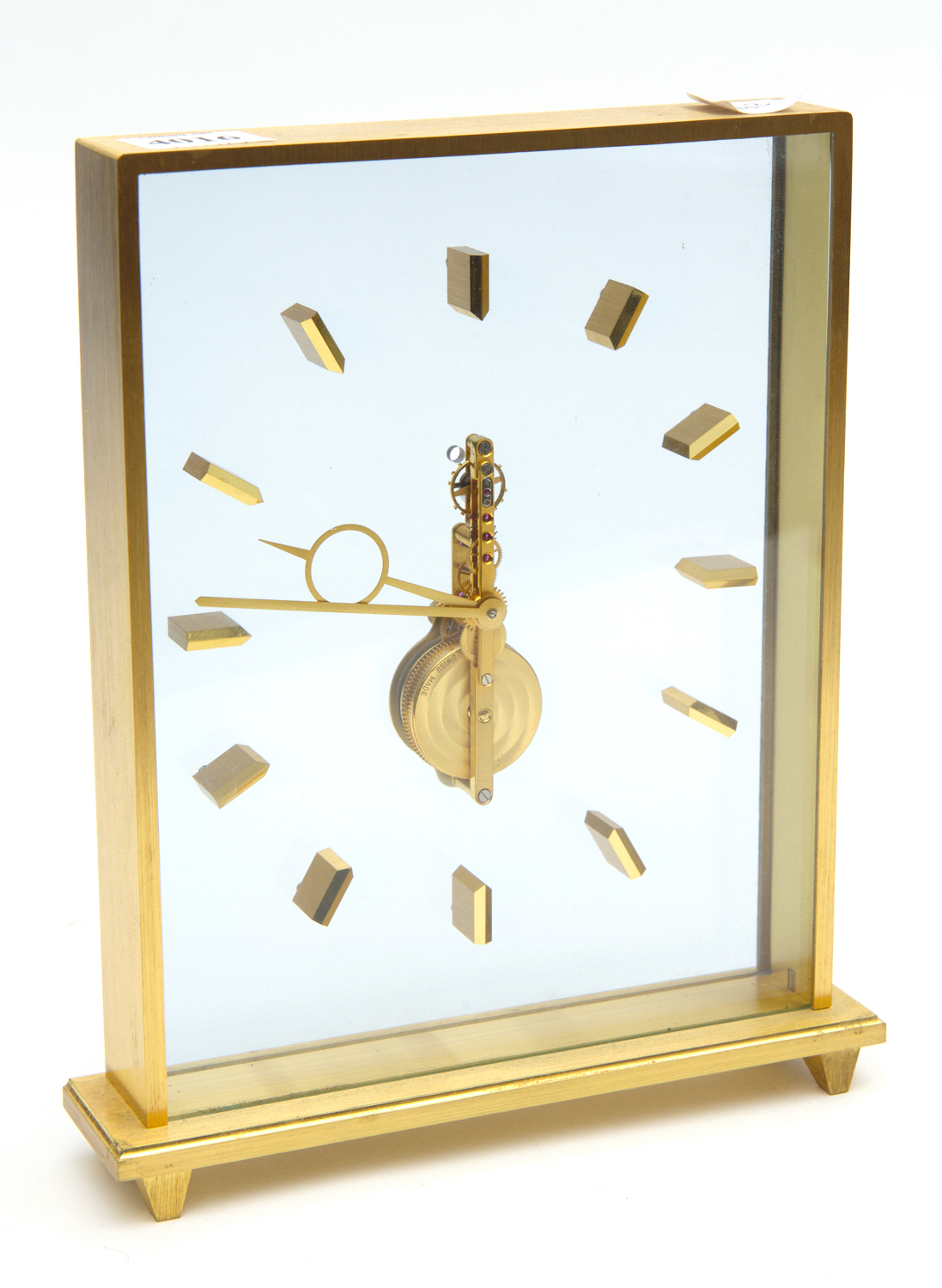 A JAEGER LECOULTRE INLINE BRIDGE DESK CLOCK, STAMPED 355 BENEATH THE RIGHT FOOT, THE JAEGER LABEL NOW MISSING, THE SKELETONISED JEWELLED 8 DAY MOVEMENT STAMPED 'SWISS MADE', HOUSED WITHIN A BRUSHED BRASS CASE GLAZED TO THE FRONT AND BACK, 20 CM HIGH