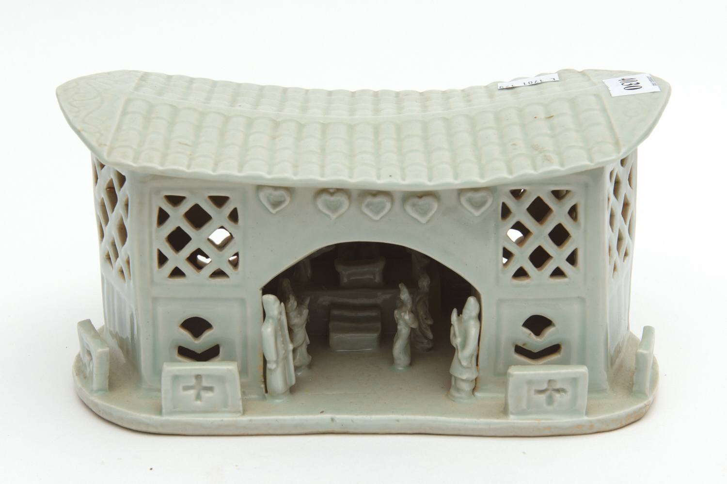 A QINGBAI STYLE POTTERY PILLOW, OF ARCHITECTURAL FORM, WITH AN OPEN CENTRAL SECTION DEPICTING FIGURES IN A PAVILLION, WITH LATTICE-PIERCED SIDES, 22 CM WIDE, 10.5 CM HIGH, 12 CM DEPTH
