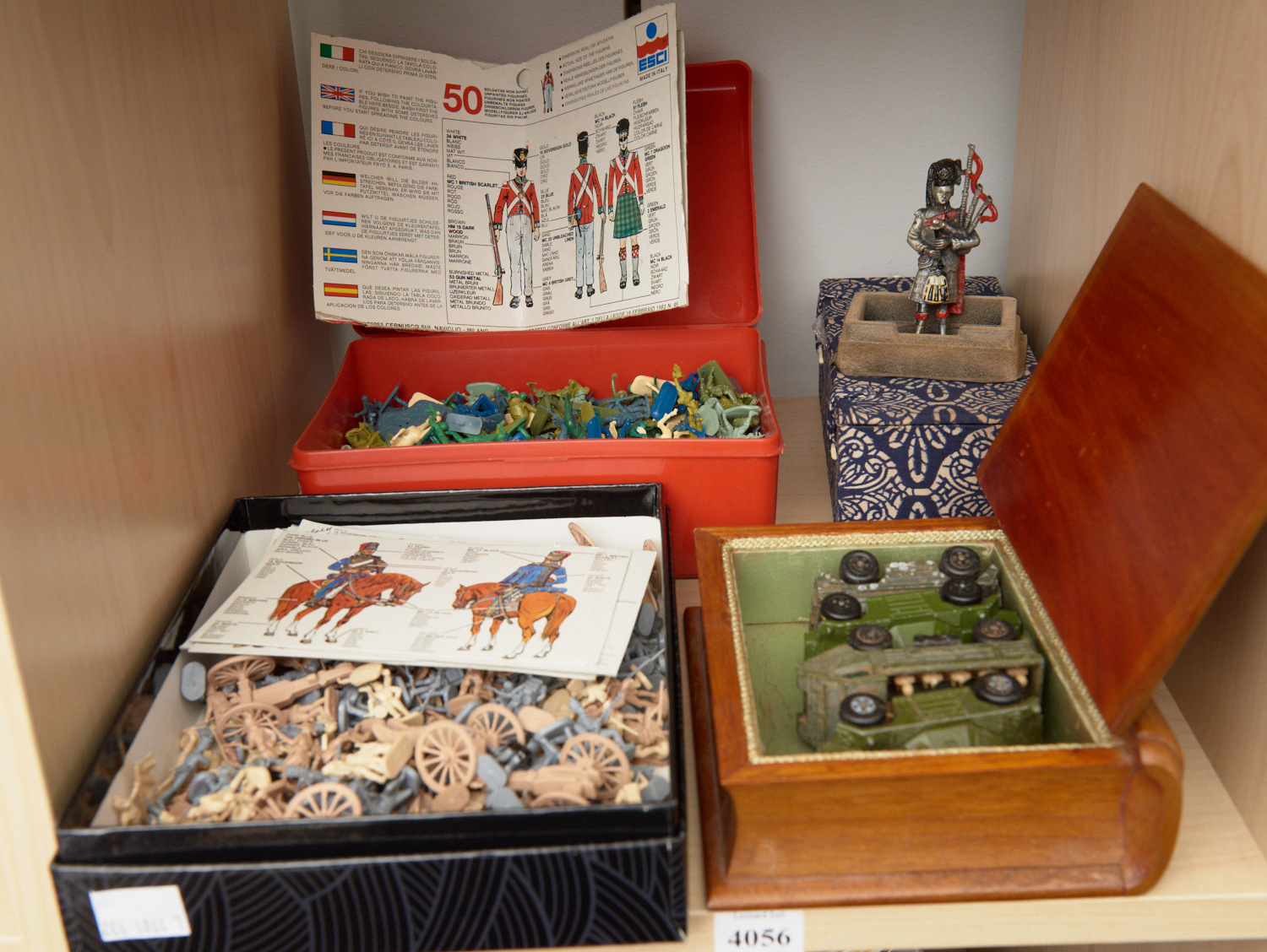 FOUR BOXES CONTAINING ASSORTED PLASTIC AND CAST METAL MILITARY FIGURINES AND FOUR MATCHBOX MILITARY VEHICLES (A/F)