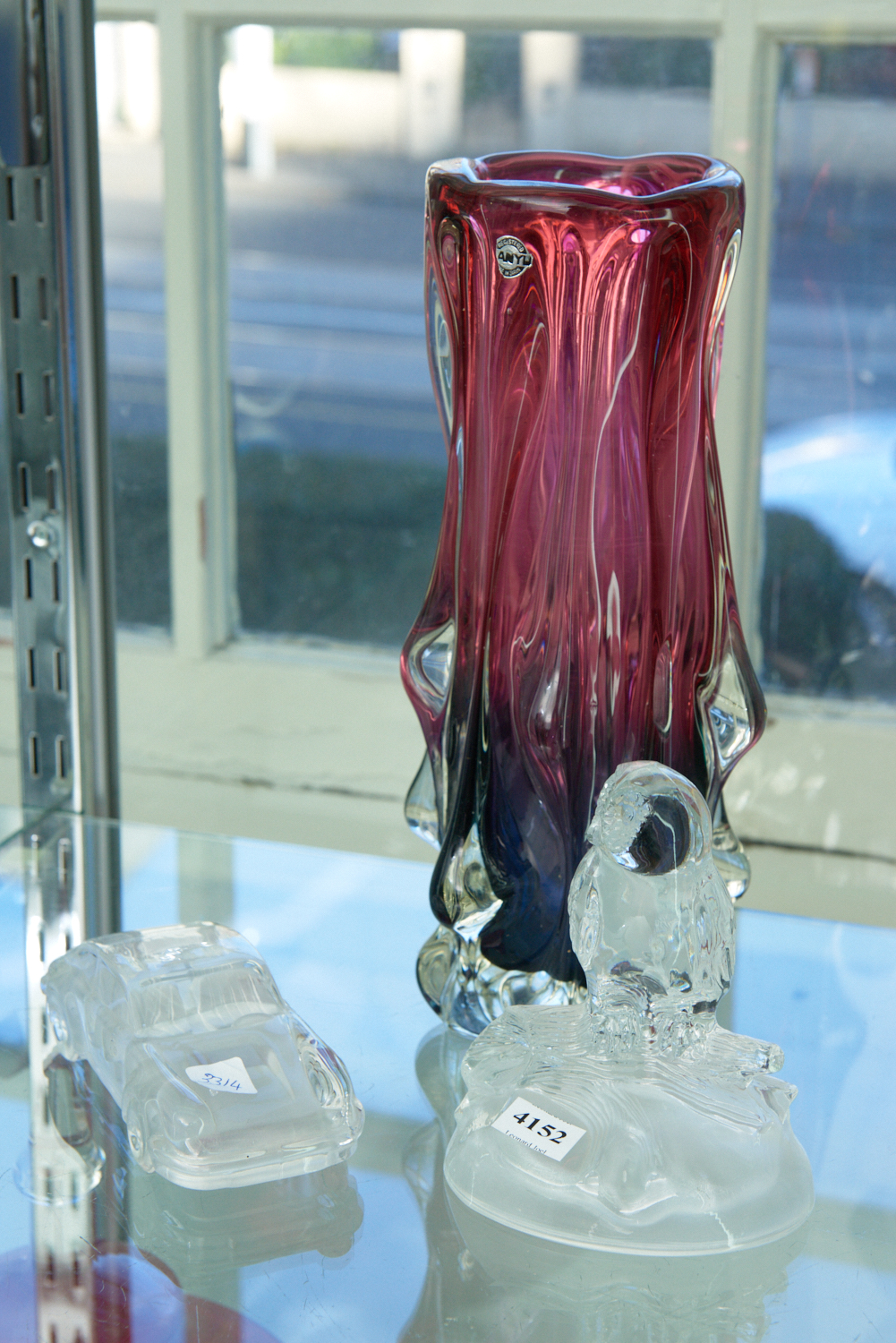 A COLLECTION OF GLASS NOVELTY ORNAMENTS, INCLUDING A MODEL OF A PORSCHE 911 BY HOF BAUER, A MODEL OF AN OWL AND A JAPANESE ART GLASS VASE (CHIP TO BASE), THE VASE 31 CM HIGH