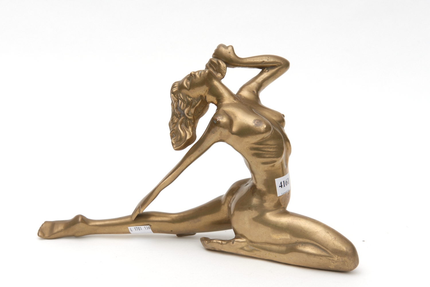 A BRASS FIGURE OF A FEMALE NUDE, 33 CM WIDE
