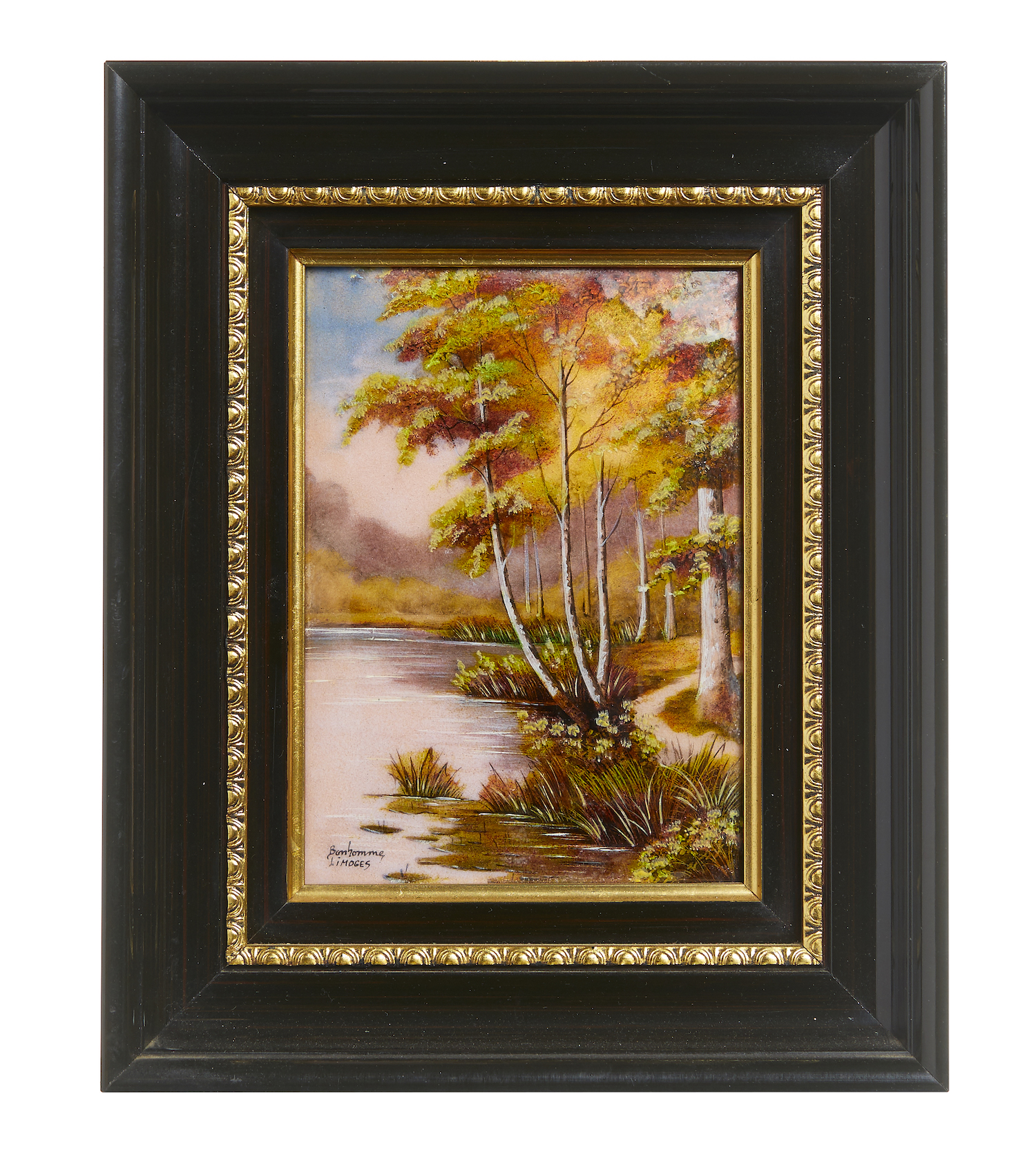 Rectangular, convex, depicting trees on a riverbank, signed lower left 'Bonhomme, LIMOGES'.