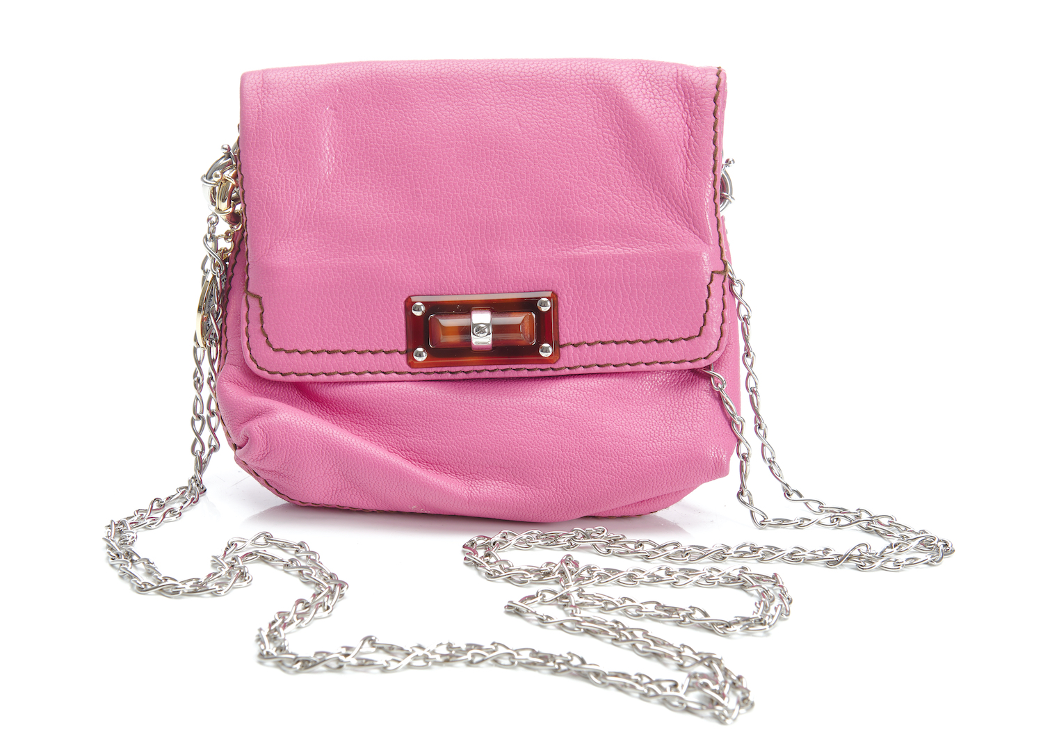 Styled in pink leather with resin clasp and long silver metal chain strap, 16 x 16 x 3cm.