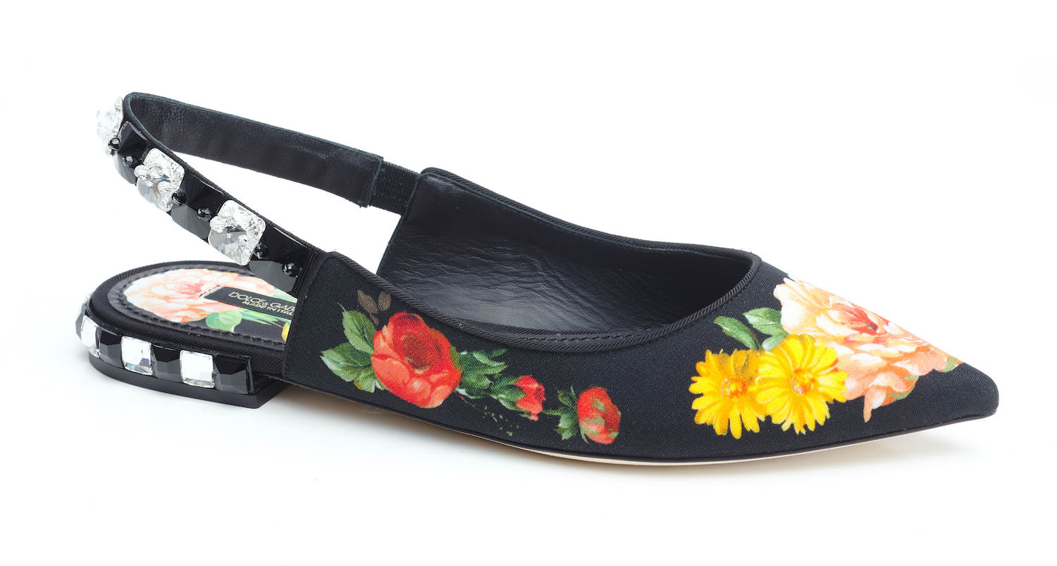 Styled in a rose patterned canvas with leather trim and crystal embellishment, labelled size 37.5, boxed.