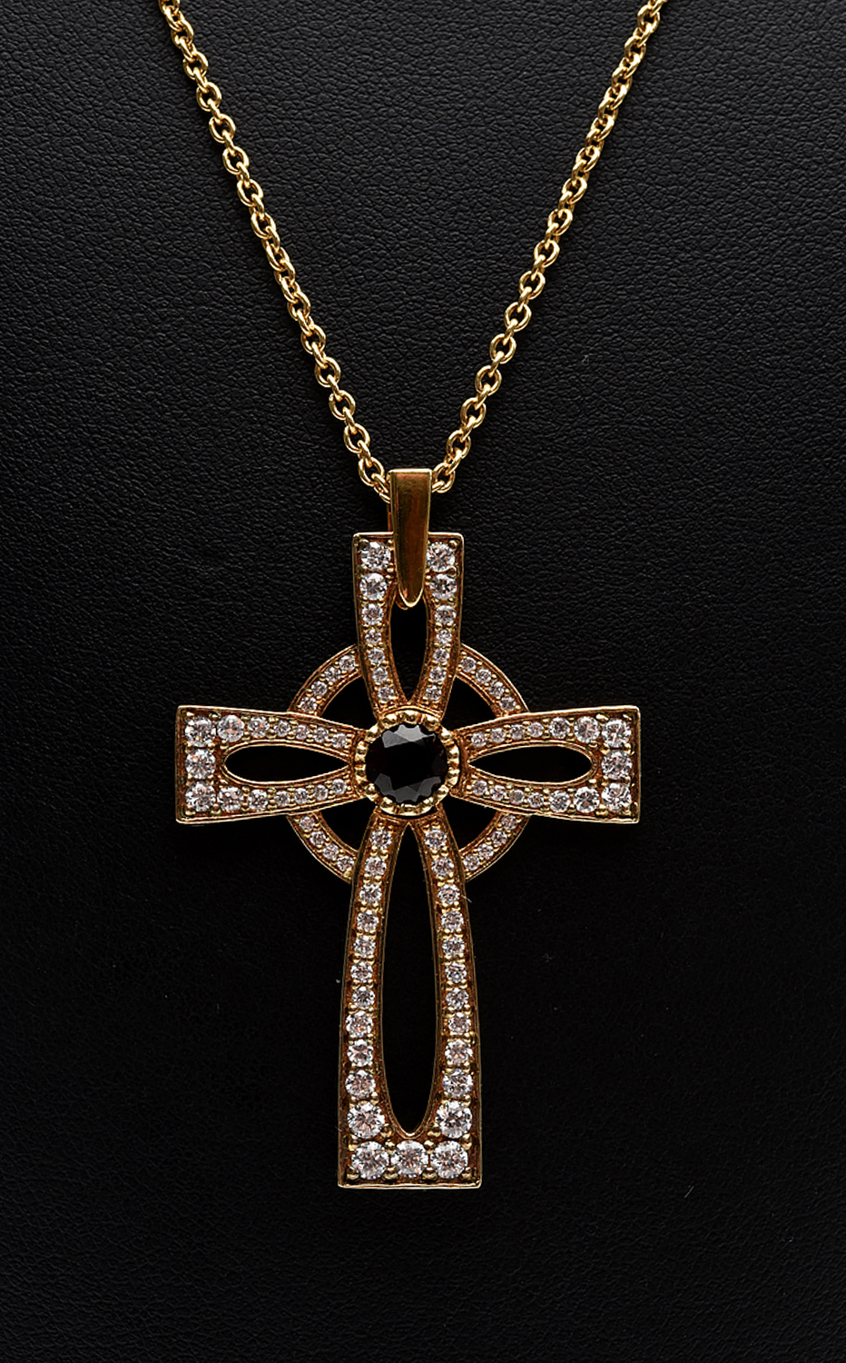 A CELTIC STYLE CROSS PENDANT SET WITH A GARNET AND CUBIC ZIRCONIA, WITH CHAIN, ALL IN SILVER GILT
