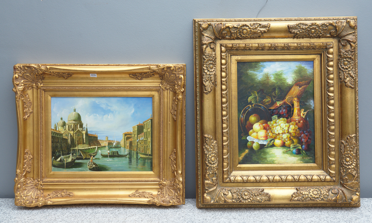 TWO GILT FRAMED DECORATIVE PAINTINGS, ONE DEPICTING A VENITIAN SCENE, THE OTHER DEPICTING A DUTCH MANNER STILL LIFE WITH FRUIT, OIL ON BOARD, 29 X 39.5 CM AND 39.5 X 29.5 CM