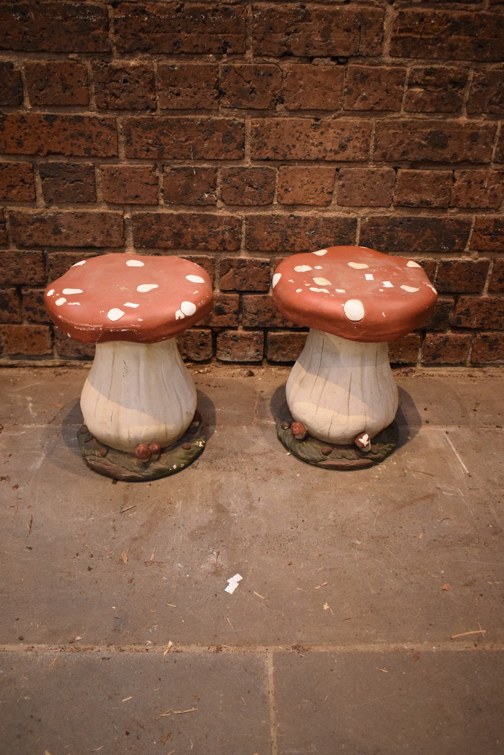 A PAIR OF PAINTED GARDEN TOADSTOOLS (34H X 29D CM)