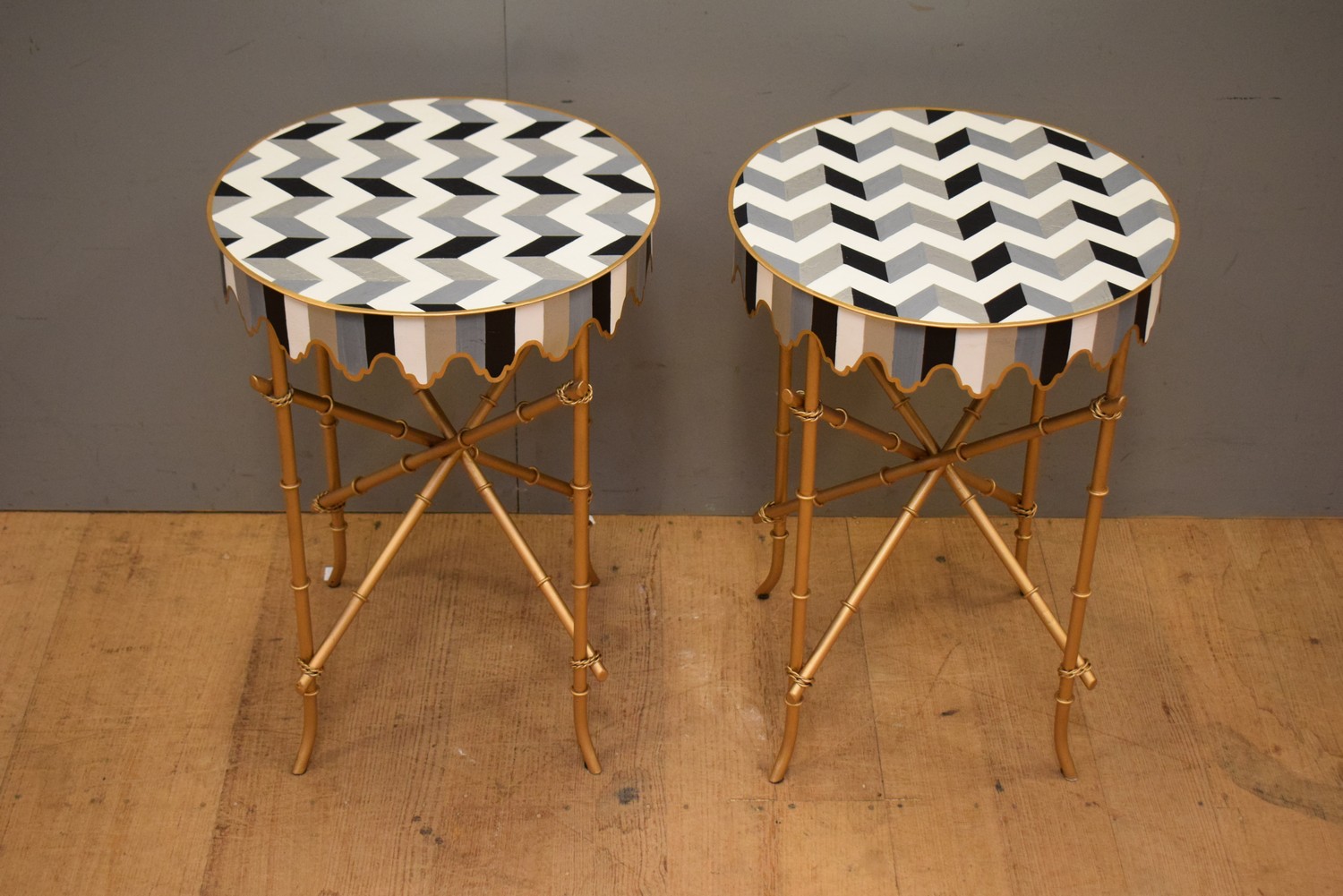 A PAIR OF BAMBOO EFFECT SIDE TABLES WITH STRIPED PAINTED TOP (56H X 40D CM)