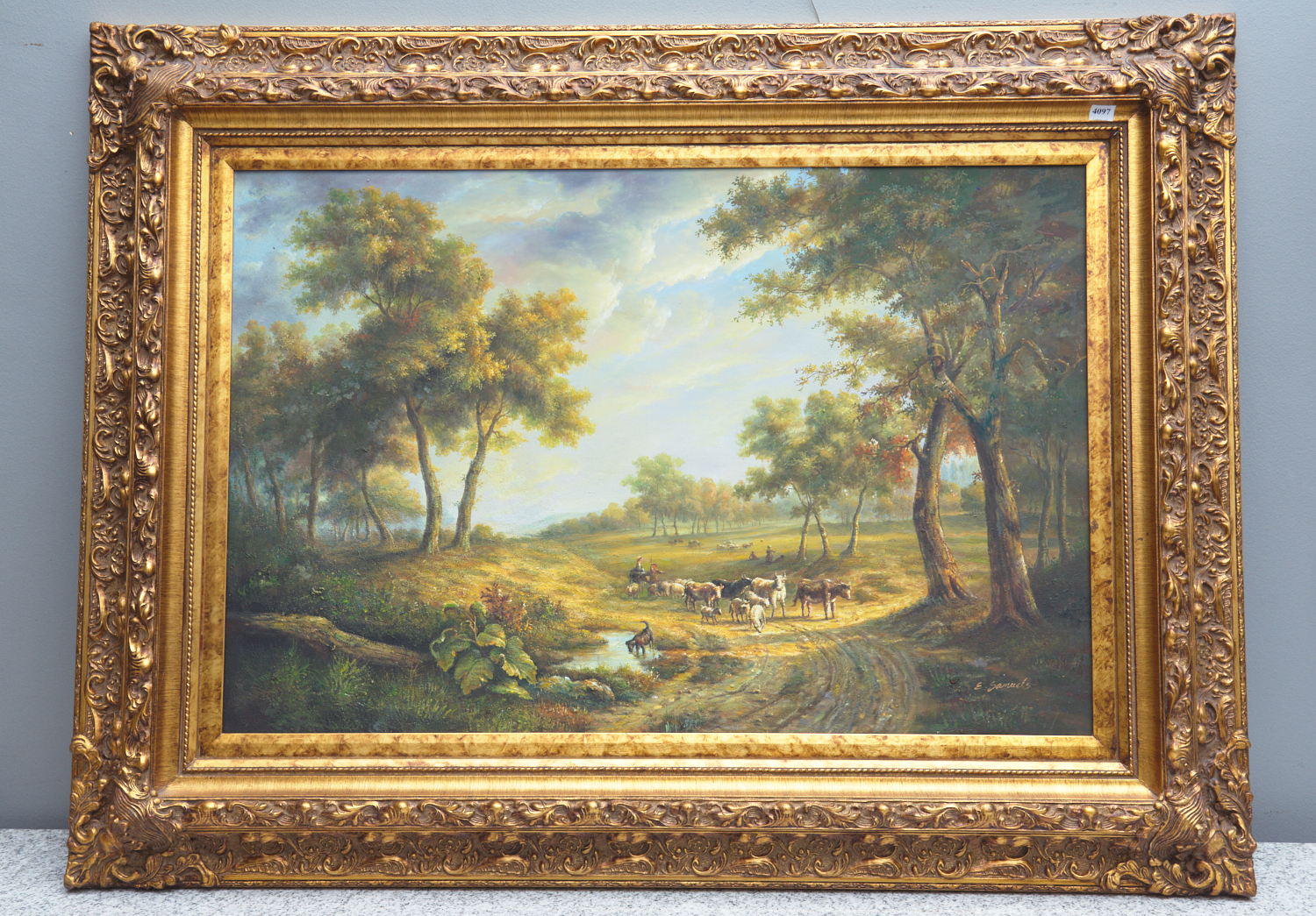 E. SAMUELS, CATTLE ON A COUNTRY ROAD (20TH CENTURY), OIL ON CANVAS, 60 X 90 CM