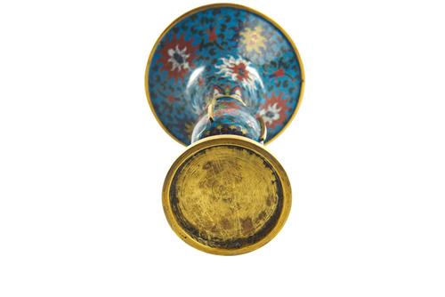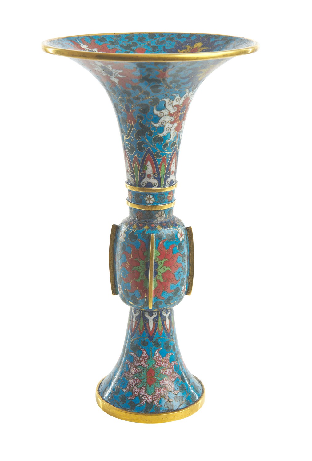 The tall gu form of gilded copper covered with cloisonne decoration of scrolling lotus against a turquoise enamel ground.