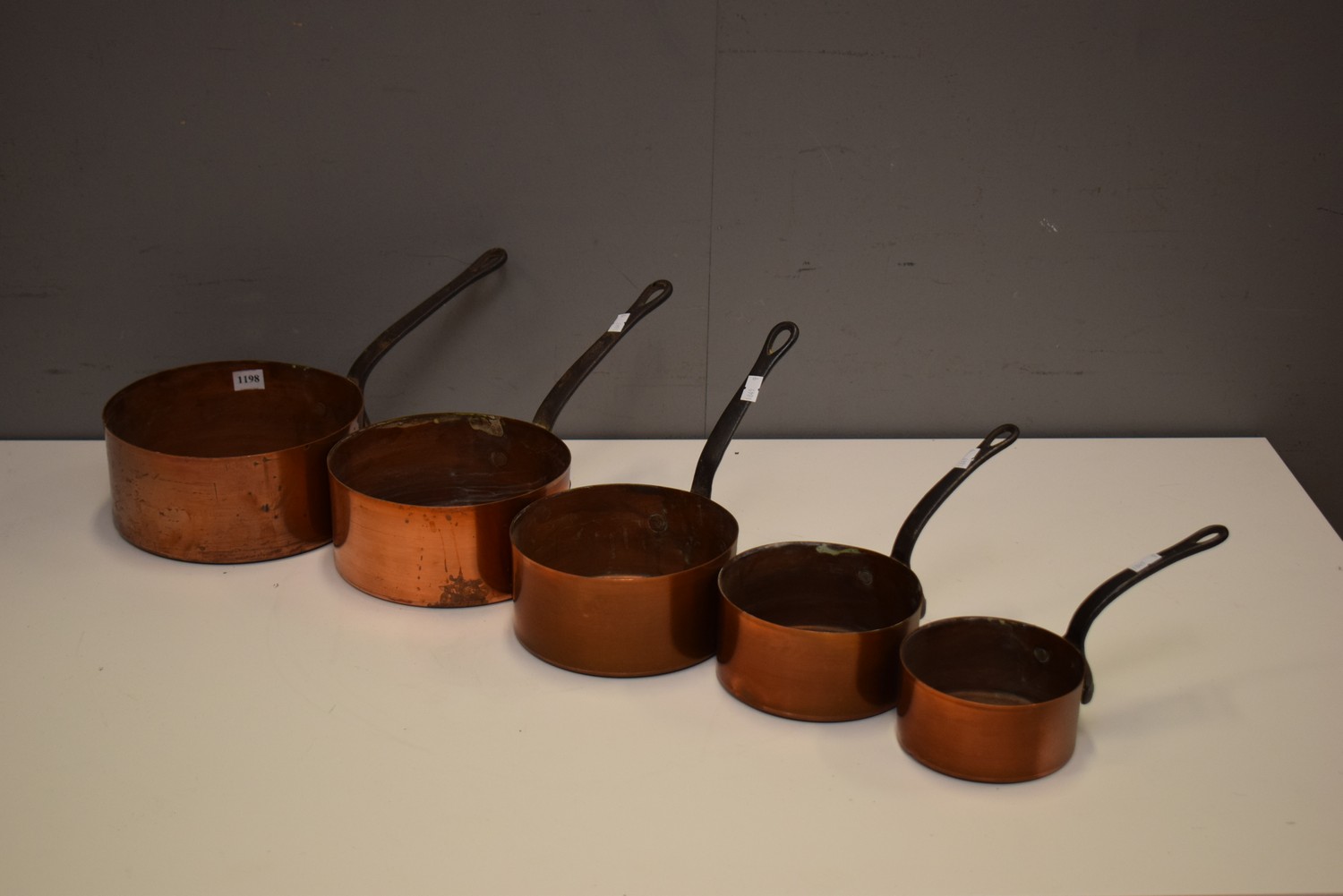 A SET OF FIVE FRENCH COPPER SAUCEPANS (LARGEST 21 CM D)