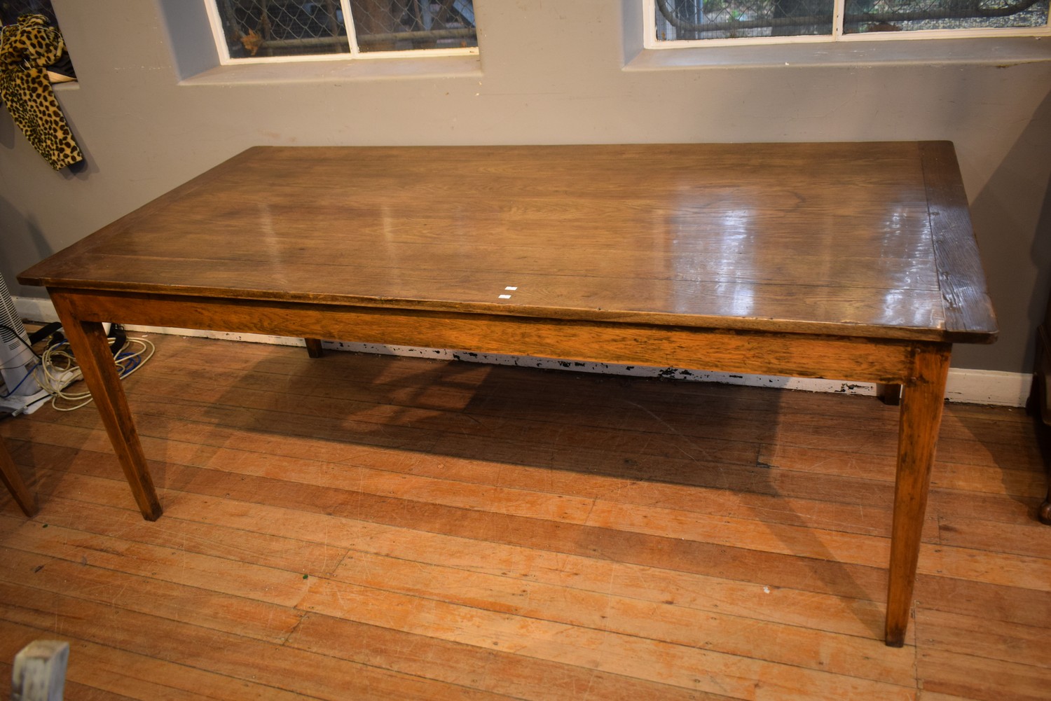 AN OAK FARMHOUSE STYLE DINING TABLE (77H X 210W X 100D CM) (PLEASE NOTE THIS ITEM MUST BE REMOVED BY CLIENTS OR CARRIERS AT THE CUSTOMERS EXPENSE)