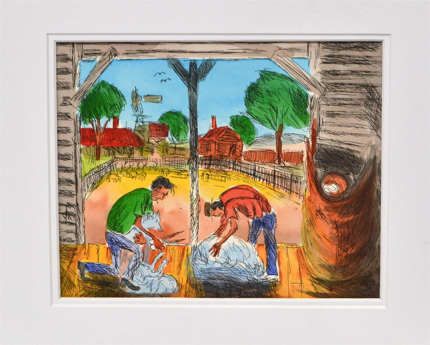 PRO HART, THE BLADE SHEARERS, HAND COLOURED ETCHING, UNSIGNED, 21 X 25CM, ACCOMPANIED BY CERTIFICATE OF AUTHENTICITY FROM ROBERT LITTLEWOOD