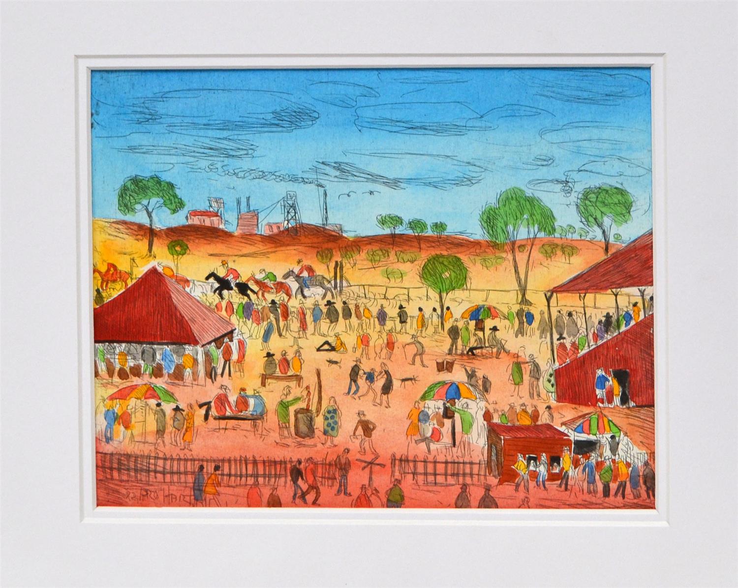 PRO HART, ST PATRICK'S RACE DAY MEETING, BROKEN HILL, HAND COLOURED ETCHING, UNSIGNED, 21 X 25CM, ACCOMPANIED BY CERTIFICATE OF AUTHENTICITY FROM ROBERT LITTLEWOOD