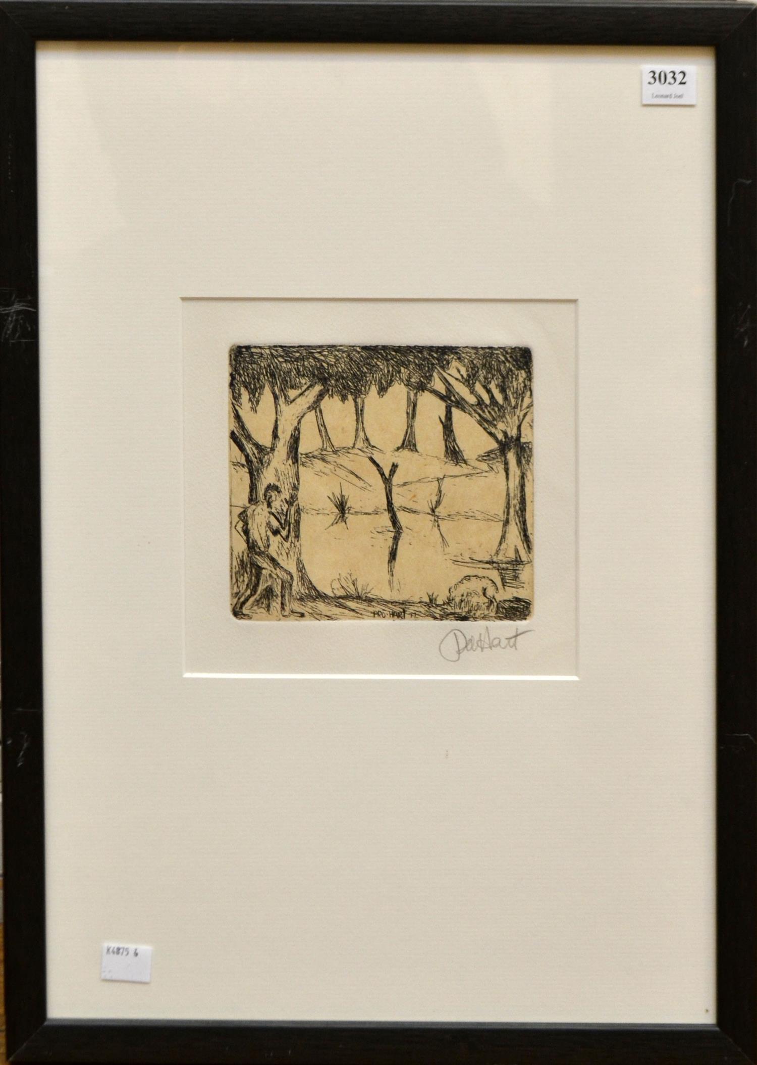 PRO HART, UP CAME A JUMPBUCK TO DRINK AT THE WATERHOLE FROM THE WALTZING MATILDA SERIES, ETCHING 74/100, SIGNED BELOW IMAGE, EDITIONED ON LABEL VERSO, 12.5 X 14CM, FRAME SIZE: 49 X 35.5CM, CONDITION: GOOD, WEAR TO FRAME
