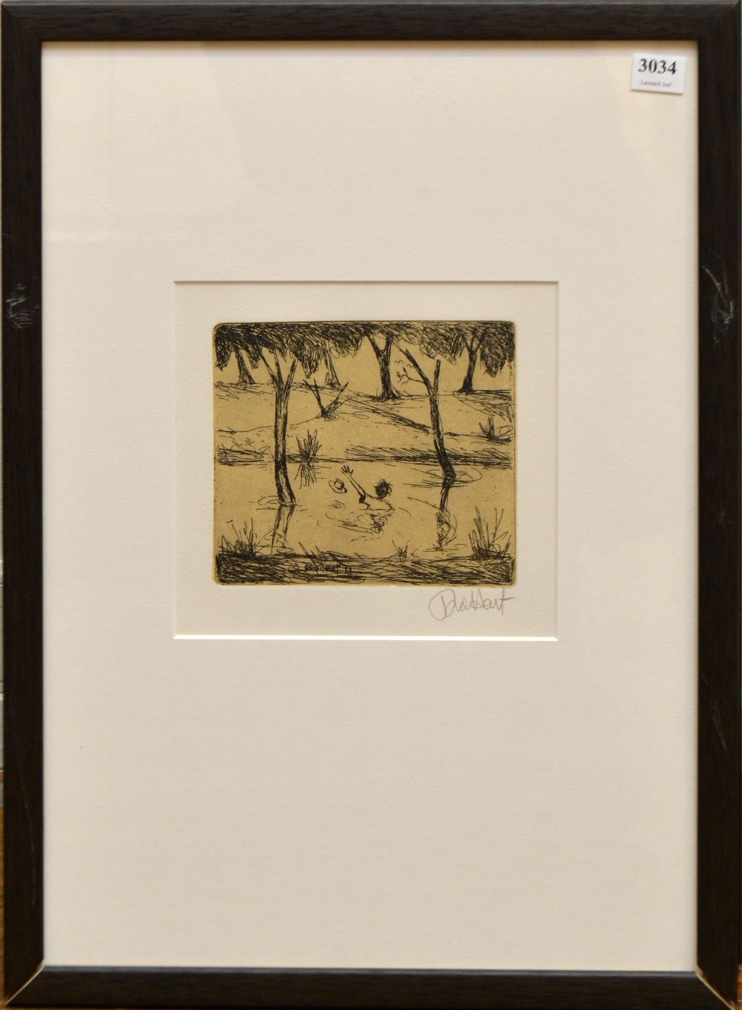 PRO HART, DROWNING HIMSELF BY THE COOLIBAH TREE FROM THE WALTZING MATILDA SERIES, ETCHING 74/100, SIGNED BELOW IMAGE, EDITIONED ON LABEL VERSO, 12.5 X 14CM, FRAME SIZE: 49 X 35.5CM, CONDITION: GOOD, WEAR TO FRAME