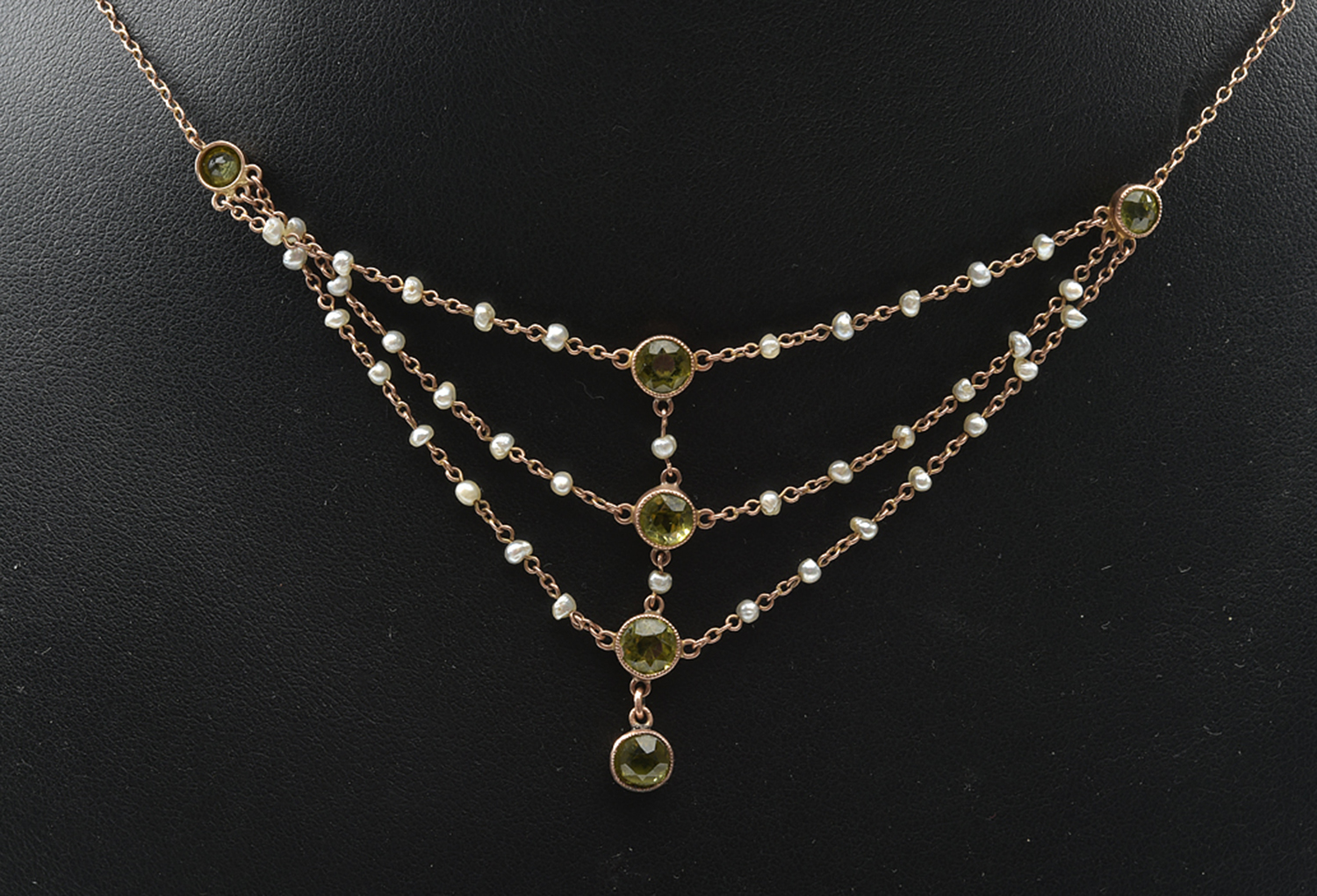 AN EDWARDIAN PERIDOT AND NATURAL SEED PEARL NECKLACE IN 9CT GOLD, TOTAL LENGTH 440MM, 3.7GMS