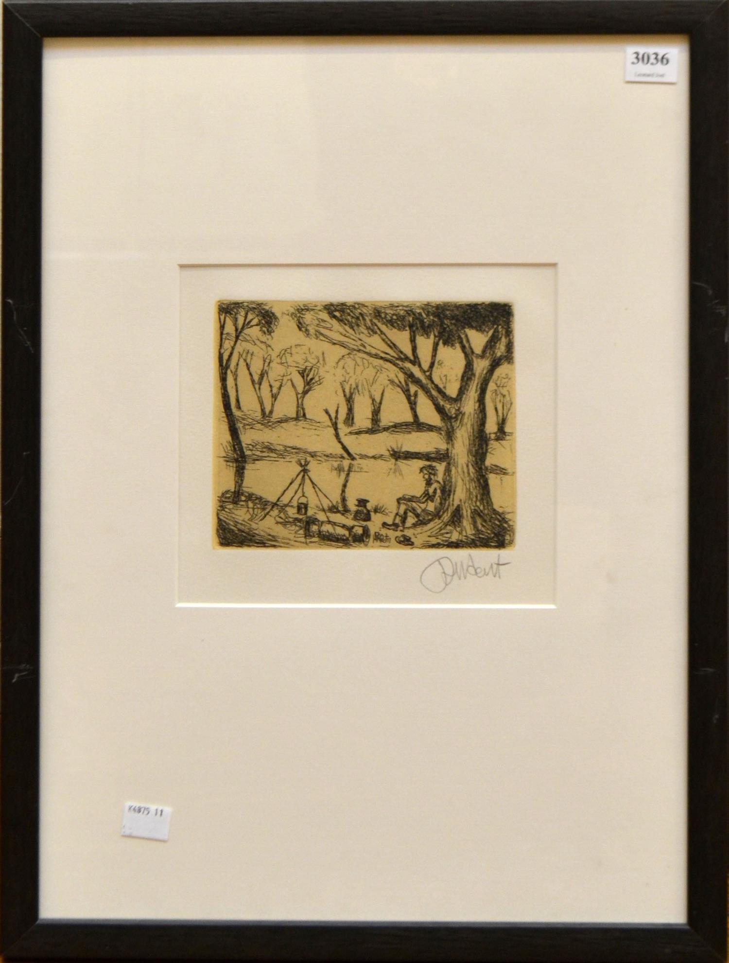 PRO HART, OH THERE WAS ONCE A SWAGMAN CAMPED IN THE BILLABONGS FROM THE WALTZING MATILDA SERIES, ETCHING 74/100, SIGNED BELOW IMAGE, EDITIONED ON LABEL VERSO, 12.5 X 14CM, FRAME SIZE: 49 X 35.5CM, CONDITION: GOOD, WEAR TO FRAME
