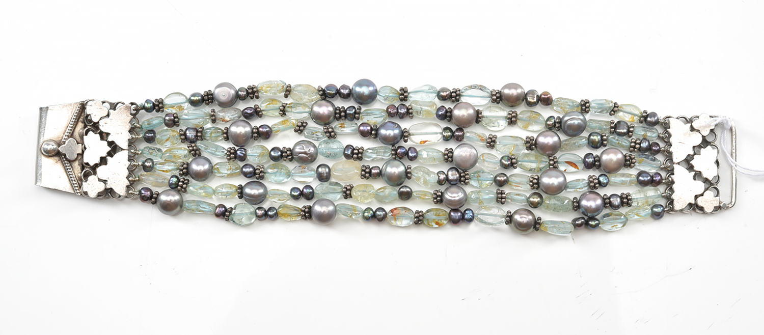 A MULTISTRAND AQUAMARINE AND FRESHWATER PEARL BRACELET IN STERLING SILVER, TOTAL LENGTH 188MM