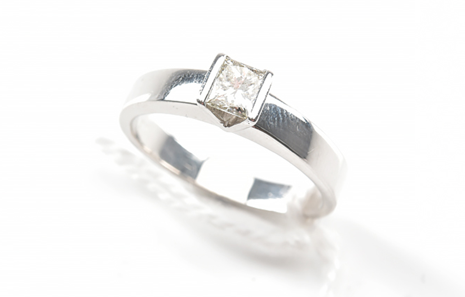 A SOLITAIRE DIAMOND RING SET WITH A PRINCESS CUT DIAMOND ESTIMATED 0.45CT, IN 18CT WHITE GOLD, SIZE P, 6GMS