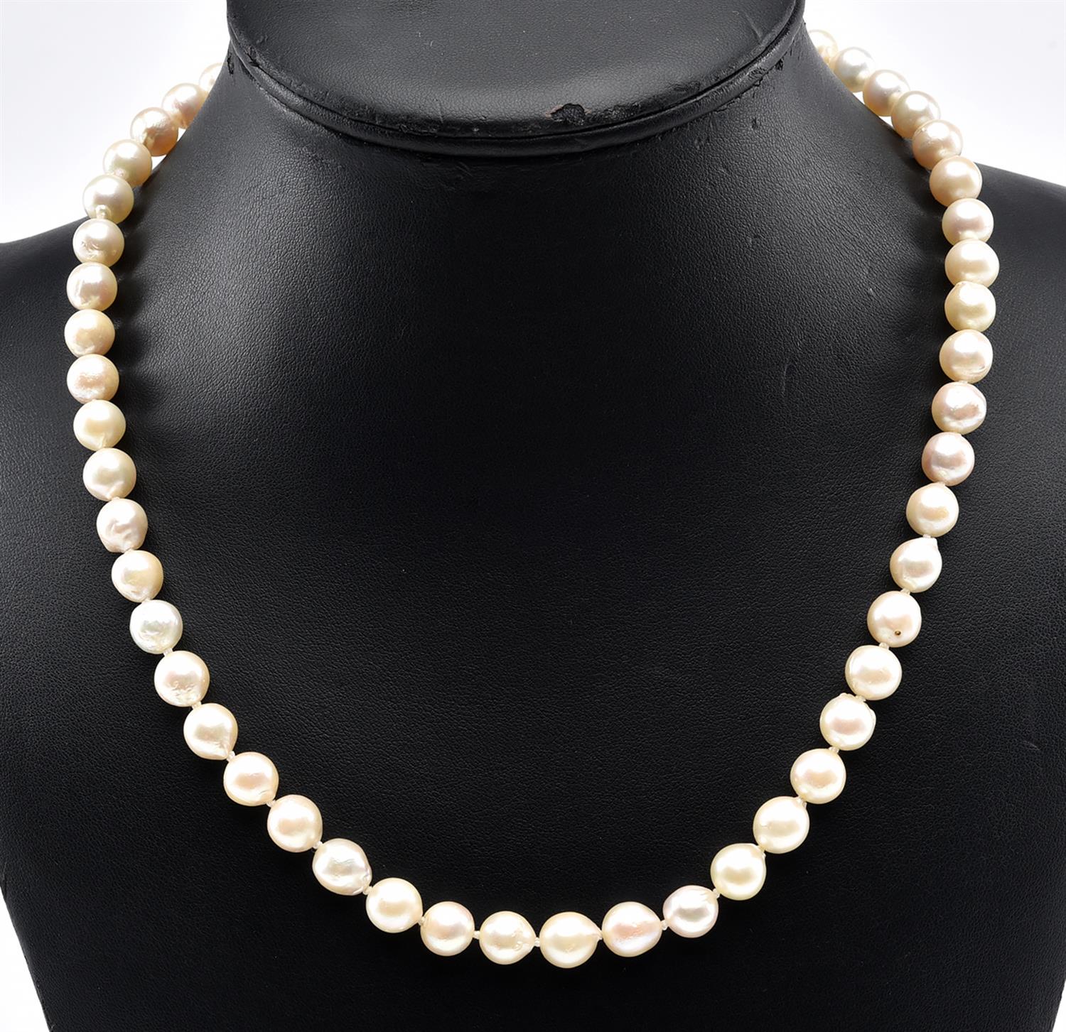 A CULTURED PEARL NECKLACE, THE CLASP IN SILVER GILT, TOTAL LENGTH 510MM