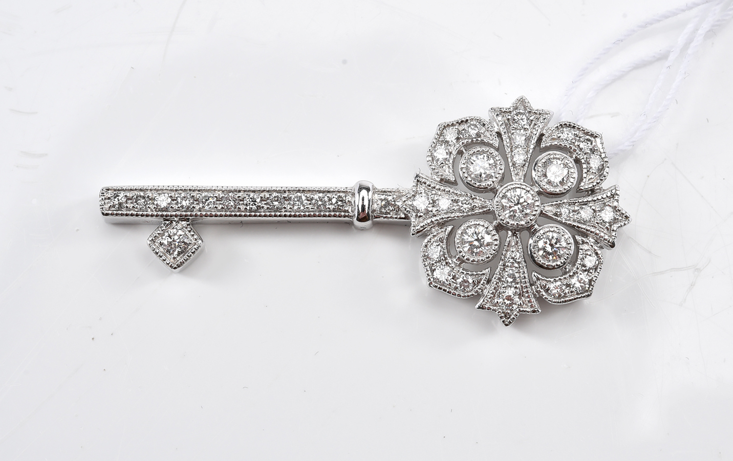 A DIAMOND KEY PENDANT TOTALLING 0.75CT, IN 10CT WHITE GOLD, TOTAL LENGTH 40MM, 4.2GMS