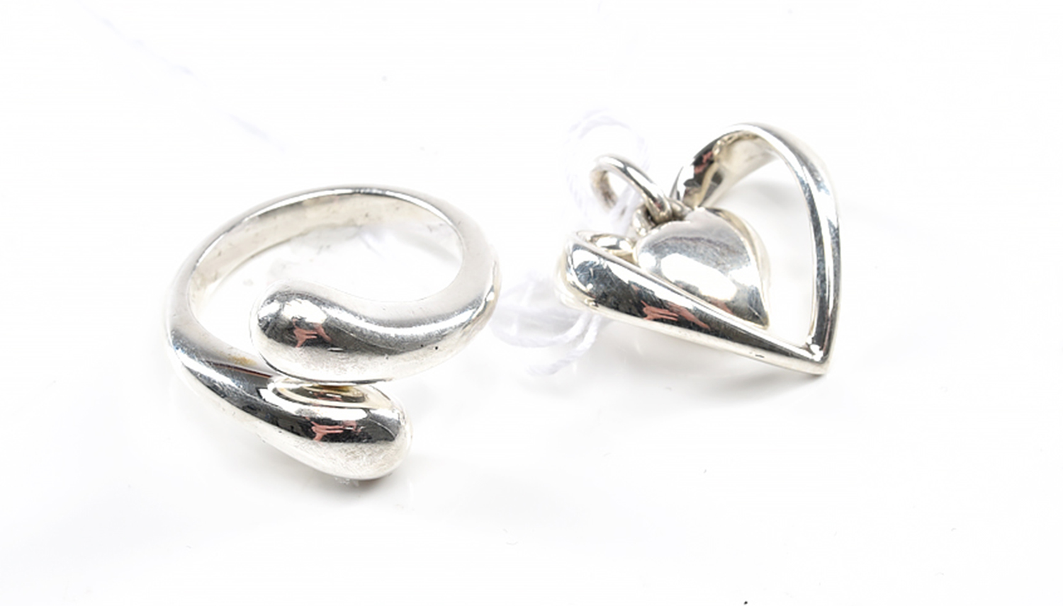A BYPASS RING BY GEORG JENSEN IN STERLING SILVER, NUMBER 411, DESIGNED BY AGNETE DINESEN, SIZE L, TOGETHER WITH A HEART PENDANT BY GEORG JENSEN IN STERLING SILVER